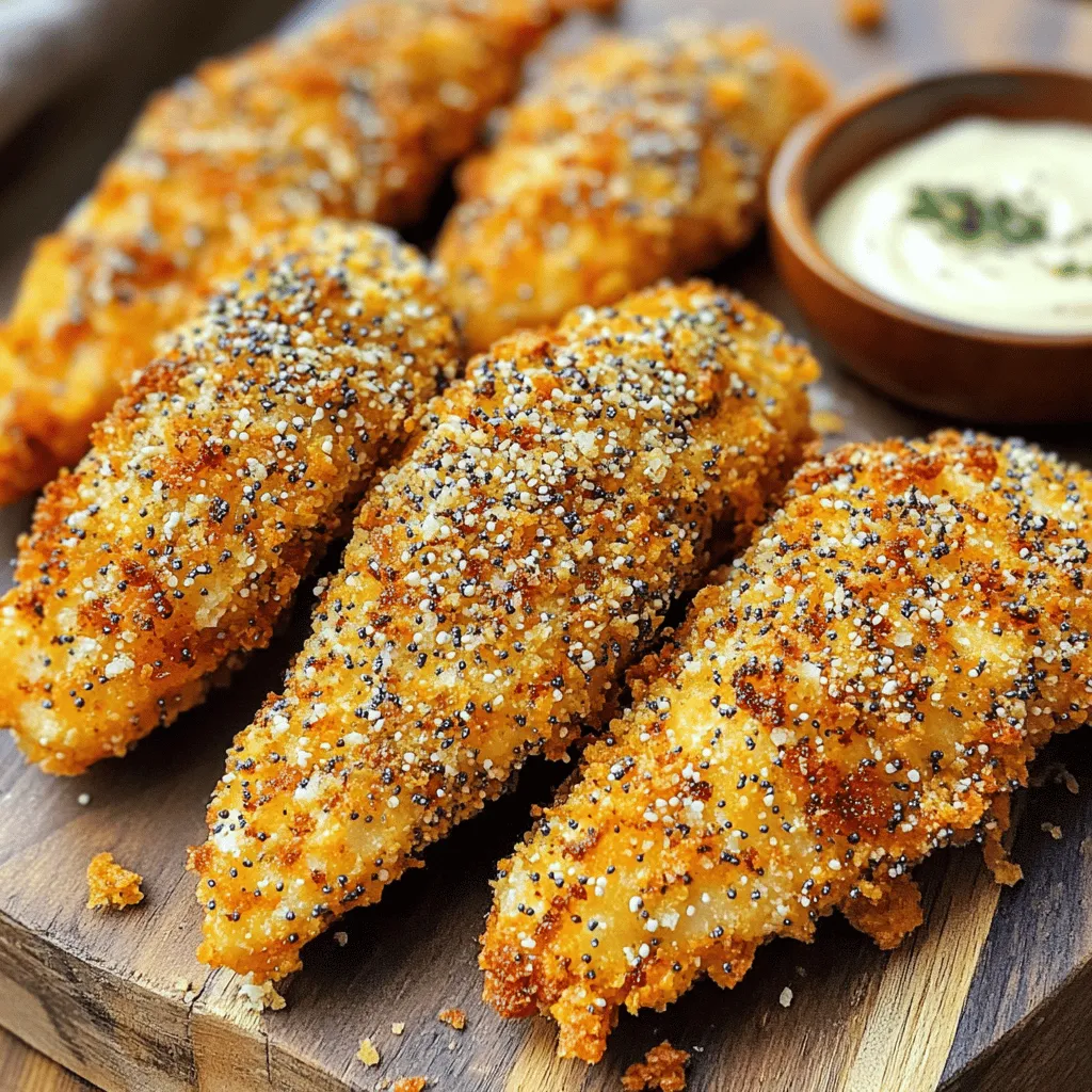Start with chicken tenders. They are tender and cook fast. Buttermilk or yogurt adds moisture and flavor. Flour helps the coating stick. Panko breadcrumbs give crunch, while everything bagel seasoning adds a unique twist. Garlic and onion powders bring depth, and salt and pepper enhance the taste. Finally, olive oil spray gives a golden finish.