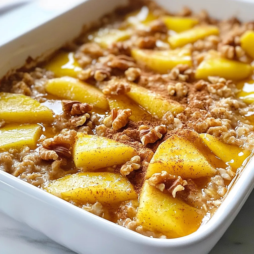 A warm and comforting baked oatmeal dish featuring apples and cinnamon, perfect for breakfast or a snack.