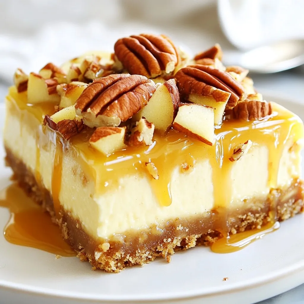 Delicious cheesecake bars with a graham cracker crust, topped with apples and pecans.
