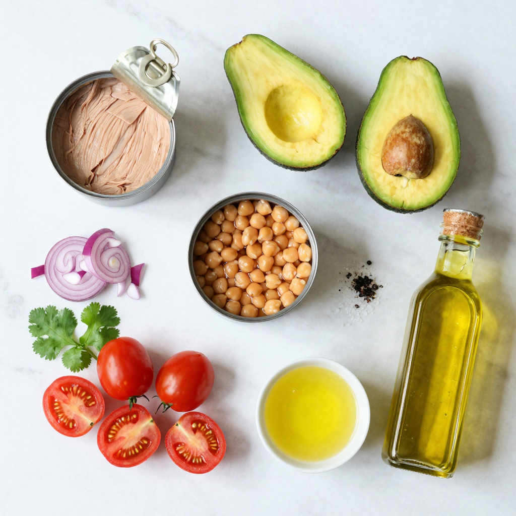Gathering the right ingredients is key. For this salad, I start with my main ingredients. The tuna gives a nice protein boost. The avocado adds creaminess and healthy fats. Chickpeas bring texture and fiber.