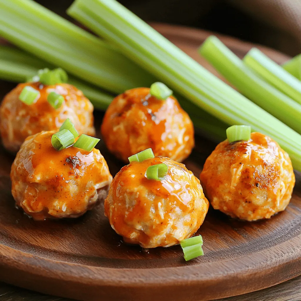 ![For these baked buffalo chicken meatballs, you need a few key items: - 1 pound ground chicken - 1/2 cup whole wheat breadcrumbs - 1/4 cup grated Parmesan cheese These main ingredients create a hearty base. Ground chicken keeps the meatballs moist. The breadcrumbs help hold everything together while adding a nice texture. Parmesan cheese brings a rich, savory flavor that enhances each bite. Next, let’s add some flavor: - 1/4 cup finely chopped green onions - 1/4 cup buffalo sauce - 1 teaspoon garlic powder - 1 teaspoon onion powder Chopped green onions add a fresh crunch. Buffalo sauce gives the meatballs that famous spicy kick. Garlic and onion powder boost the overall flavor, making each meatball taste amazing. Finally, we need a few seasonings: - Salt and pepper to taste - Cooking spray Salt and pepper are essential for balancing flavors. They bring out the taste of the chicken and other ingredients. Cooking spray helps the meatballs bake evenly without sticking to the pan. With these ingredients, you are ready to make a tasty treat! For the full recipe, check out the [Full Recipe]. First, preheat your oven to 400°F (200°C). This step warms the oven for even cooking. Next, line a baking sheet with parchment paper. It helps prevent sticking. Lightly spray the parchment with cooking spray. This makes cleanup easy. In a large mixing bowl, combine all ingredients. Use ground chicken, breadcrumbs, Parmesan cheese, and chopped green onions. Add the egg and buffalo sauce. Don't forget the garlic powder, onion powder, and season with salt and pepper. Mix until all ingredients are well combined. This ensures every bite is full of flavor. Now it’s time to shape the meatballs. Use your hands to form the mixture into 1-inch meatballs. This size cooks evenly and is easy to eat. Place the meatballs on the prepared baking sheet. Make sure to leave some space between each one. This allows hot air to circulate and cook them well. Bake the meatballs for 20-25 minutes. They should reach an internal temperature of 165°F (74°C). This ensures they are safe to eat. If you want extra flavor, drizzle more buffalo sauce over the meatballs in the last 5 minutes. This adds a tasty kick. Once cooked, remove them from the oven. Let them cool slightly before serving. This makes them easier to handle and enhances their flavor. For the full recipe, be sure to check out the detailed instructions. Enjoy your delicious baked buffalo chicken meatballs! To make great meatballs, your mixture needs to be just right. If it is too dry, the meatballs will fall apart. If it is too wet, they may not hold their shape. Combine ground chicken, breadcrumbs, and the other ingredients well. Use your hands to mix them together, but do not overwork it. When you bake meatballs, preheat your oven to 400°F (200°C). This hot temperature helps them cook evenly. Line your baking sheet with parchment paper to keep them from sticking. Lightly spray the parchment with cooking spray for added ease. Garnishing your meatballs can elevate their look. Drizzle extra buffalo sauce over them just before serving. This adds flavor and makes them shine. Chopped green onions on top give color and freshness. You can also add celery sticks on the side. They provide a nice crunch and balance the heat. Pair these meatballs with a side of veggie sticks, like carrots or bell peppers. You can also serve them with a cool dip, like ranch or blue cheese dressing. This combo can help tone down the spice. You can adjust the spice level in your meatballs. If you want them milder, use less buffalo sauce. You can also mix in a little honey to balance the heat. If you love heat, try adding more buffalo sauce or a dash of cayenne. For a twist, try different sauces for drizzling. A sweet chili sauce can complement the buffalo sauce well. You can also use a tangy barbecue sauce for a unique flavor. Don't be afraid to experiment! {{image_2}} You can change a few ingredients and still enjoy tasty meatballs. Try using lean ground turkey instead of ground chicken. It gives a lighter taste. You can also swap in lean beef for a richer flavor. For those needing gluten-free options, use gluten-free breadcrumbs. They work just as well and keep the meatballs moist. Want to jazz up your meatballs? Add herbs or spices to the mix. Fresh parsley, dill, or oregano can add a nice touch. You can also try different hot sauces. Not all hot sauces taste the same. Some are tangy, while others are more fiery. Experimenting with sauces can help you find your perfect flavor. If you want a quicker method, consider using an air fryer. It cooks the meatballs fast and keeps them juicy. Just set it to 375°F (190°C) and check after 10-15 minutes. You can also cook the meatballs on the stovetop. Sauté them in a pan with a bit of oil. Cook until they're browned and cooked through. Each method offers a new way to enjoy your meatballs. For the complete recipe, check the [Full Recipe]. To keep your baked buffalo chicken meatballs fresh, use airtight containers. Glass or plastic containers work well. Store them in the fridge right after they cool down. The ideal fridge temperature is below 40°F (4°C). This helps keep the meatballs safe and tasty for up to four days. When you want to enjoy leftover meatballs, you have three easy options. You can use the oven, microwave, or stovetop. For the oven, preheat it to 350°F (175°C) and bake for about 10 minutes. If you use the microwave, heat for 1 to 2 minutes on high. Make sure to check if they are hot all the way through. For stovetop, place them in a pan with a splash of water. Cover and heat over medium for about 5 minutes, turning them occasionally. If you want to save your meatballs for later, freezing is a great option. First, let the meatballs cool completely. Then, place them in a freezer-safe bag or container. Remove as much air as you can. This can help prevent freezer burn. Baked buffalo chicken meatballs can last up to three months in the