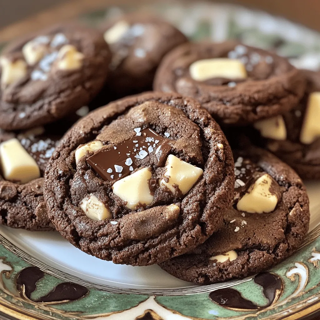 These ingredients create a rich, chocolatey cookie. The all-purpose flour gives structure. Unsweetened cocoa powder adds deep chocolate flavor. Baking soda helps the cookies rise, while salt boosts taste. Softened butter makes the cookies rich and chewy. Granulated and brown sugars add sweetness and moisture. Eggs bind the ingredients. Vanilla extract gives a lovely aroma. The semi-sweet and white chocolate chunks create a delightful contrast.