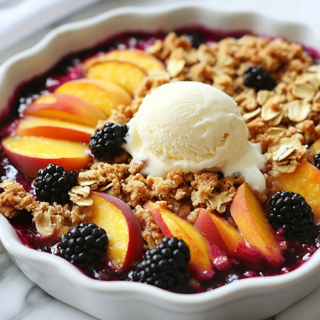 Serve your blackberry peach crisp warm for the best taste. A scoop of vanilla ice cream or whipped cream adds a creamy touch. You can also sprinkle a little cinnamon on top for extra flavor. For a fun twist, add a few whole blackberries or peach slices as a garnish. If you want to impress guests, use a fancy dish or plate. Presentation matters, and a colorful dish always looks inviting.