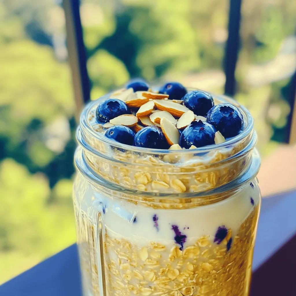 Overnight oats are packed with nutrients. They provide fiber, protein, and healthy fats. Rolled oats are whole grains and help with digestion. Greek yogurt adds protein and probiotics. Fresh blueberries bring vitamins, while almonds add crunch and healthy fats. This meal is great for energy, and it keeps you full.