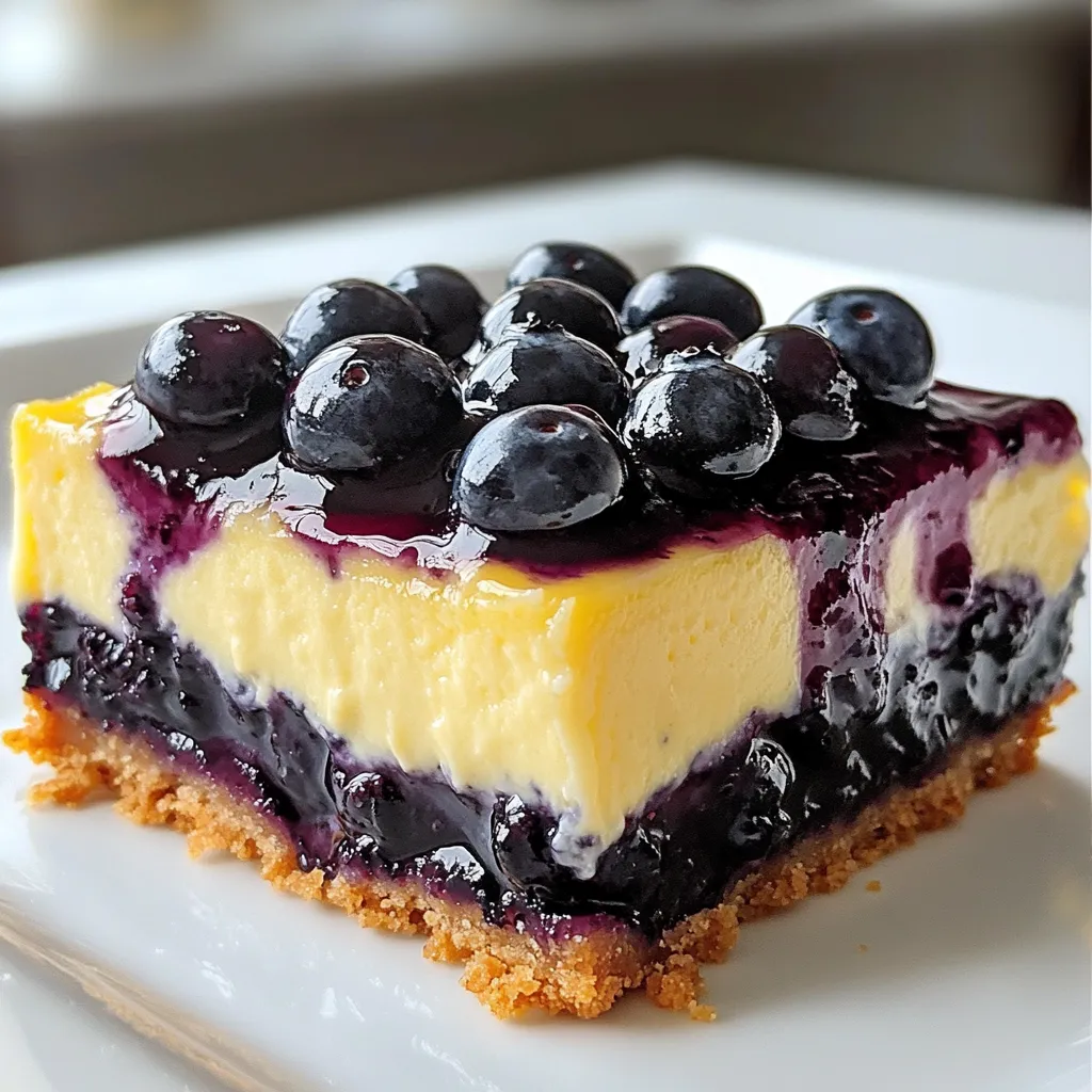 Delicious cheesecake bars with a graham cracker crust, creamy filling, and a fresh blueberry topping.