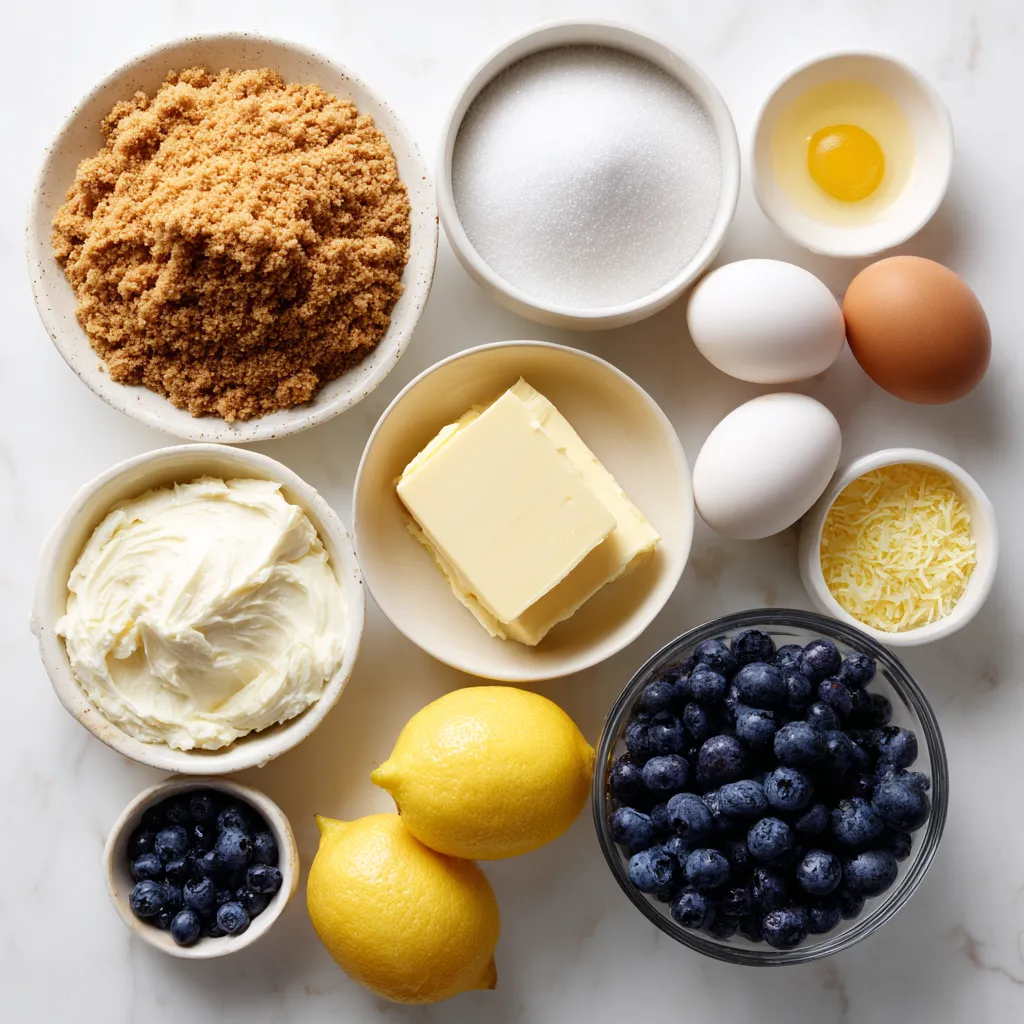 Making these blueberry lemon cheesecake bars starts with gathering your ingredients. You want to have everything ready to go.