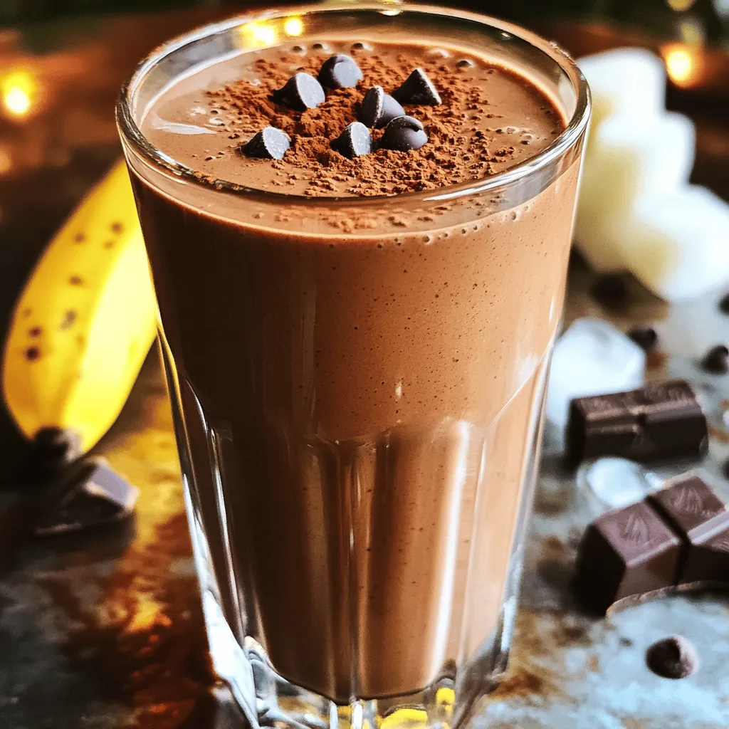 – Step 1: Combine ingredients in a blender. Add 1 cup of almond milk, 1 scoop of chocolate protein powder, 2 tablespoons of cocoa powder, 1 frozen banana, 2 tablespoons of almond butter, 1 tablespoon of maple syrup, and 1/2 teaspoon of vanilla extract. You can also add chocolate chips if you like.