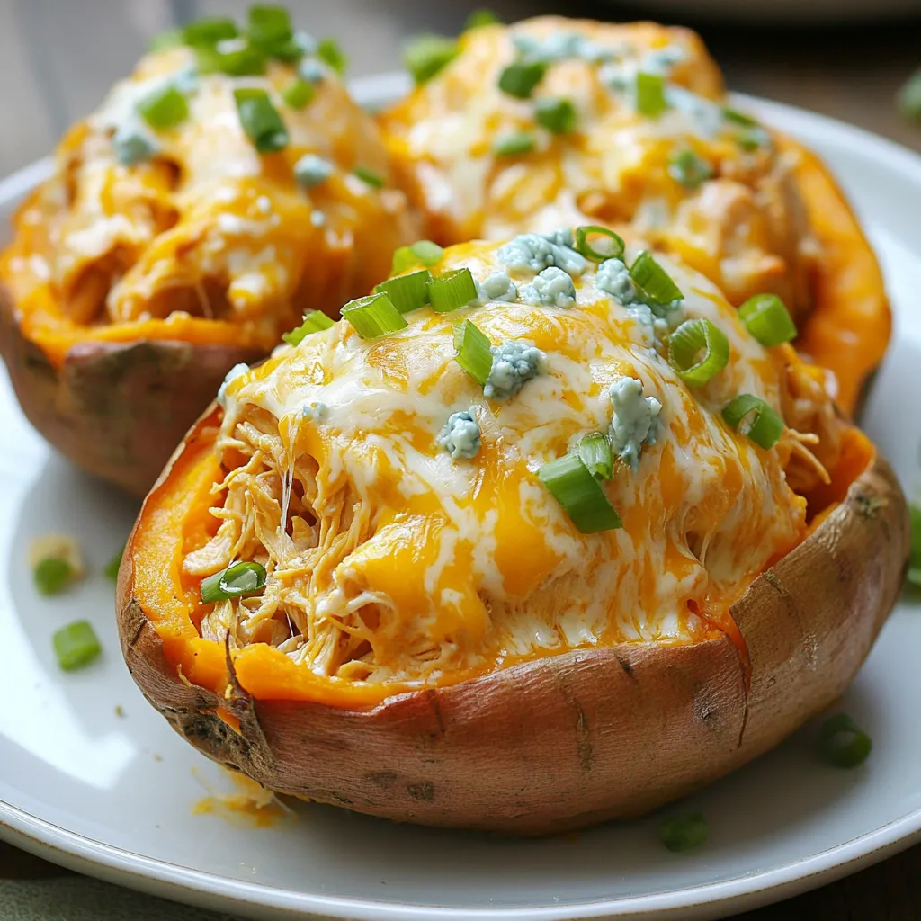 Once the sweet potatoes are done, let them cool for a few minutes. Cut each potato in half lengthwise. Scoop out a bit of the flesh to make space for the filling. Be careful not to scoop too deep! Fold the scooped sweet potato flesh into the buffalo chicken mixture. Add 1/2 cup of shredded cheddar cheese and mix well. Fill each sweet potato half with the buffalo chicken mix. If you want, sprinkle extra cheddar cheese on top. Return the stuffed potatoes to the oven for an extra 10-15 minutes. Bake until the cheese is melted and bubbly. Finally, garnish with sliced green onions and blue cheese crumbles if you like. Enjoy your savory delight!