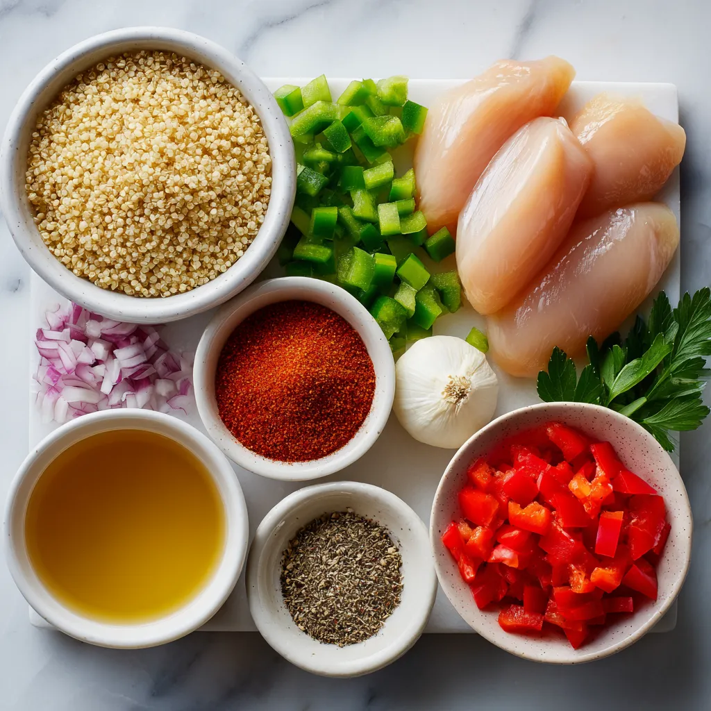 A flavorful and nutritious one-pan dish featuring chicken, quinoa, and vegetables with a spicy Cajun twist.