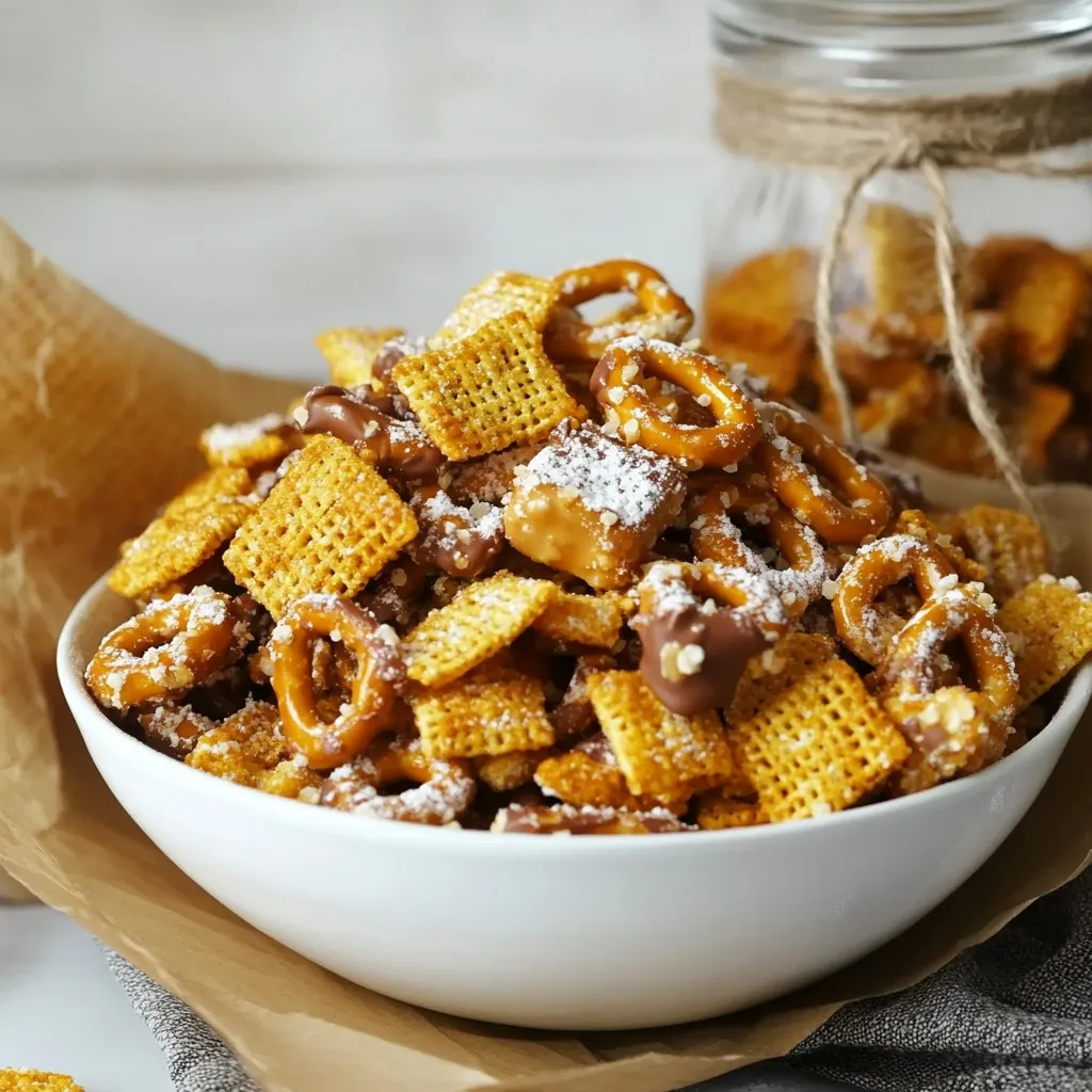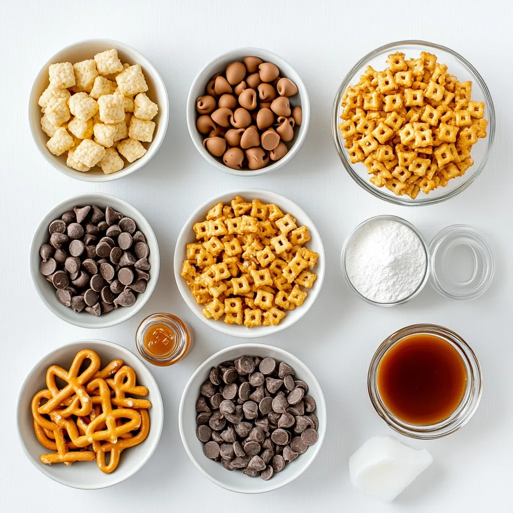 A sweet and salty snack mix combining rice Chex cereal, pretzels, chocolate, and caramel.