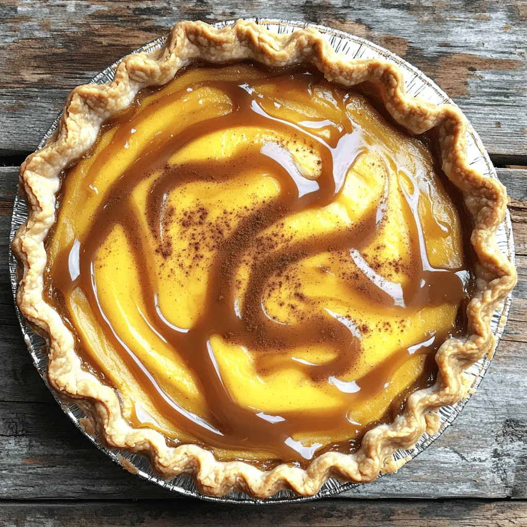 Pour the pumpkin filling into the prepared pie crust. Spread it evenly across the crust. Now comes the fun part! Take your caramel sauce and drop spoonfuls on top of the filling. Use a knife or skewer to gently swirl the caramel into the filling. Be careful not to mix it too much; you want a lovely marbled look.