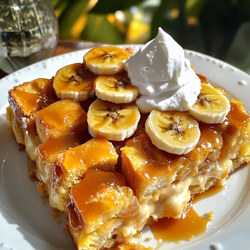 Once it’s done, allow the pudding to cool for about 10 minutes. This helps it set up a bit more. For serving, you can drizzle warm caramel sauce over each piece. A dollop of whipped cream or a scoop of vanilla ice cream adds a nice touch. Don’t forget to garnish with the reserved caramelized banana slices for extra flair! Enjoy your delightful creation!