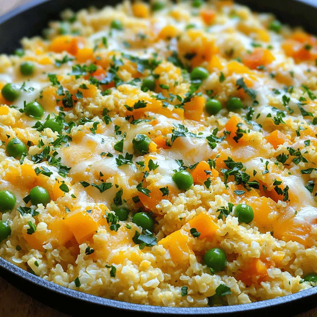 ![- 1 large head of cauliflower, riced - 1 cup sharp cheddar cheese, shredded - 1 cup mozzarella cheese, shredded - 1 tablespoon olive oil - 1 small onion, finely chopped - 2 cloves garlic, minced - 1 bell pepper (any color), diced - 1 cup frozen peas - 1 teaspoon smoked paprika - Salt and pepper to taste - Fresh parsley, chopped (for garnish) The main star of this dish is cauliflower. I always choose a large head for the best volume. Riced cauliflower gives a great texture. For the cheeses, I love the sharpness of cheddar combined with creamy mozzarella. The mix creates a rich flavor. Next, I use olive oil for cooking. It adds a nice depth to the dish. The onion, garlic, and bell pepper provide a warm base of flavor. I often add frozen peas for color and sweetness. Smoked paprika is a must for a hint of smokiness. Salt and pepper are key for seasoning, while fresh parsley brightens the plate. - Additional vegetables (zucchini, carrots, etc.) - Different cheese varieties (Parmesan, Gouda) - Spices and herbs for added flavor Feel free to swap in your favorite veggies. Zucchini and carrots work well. You can also try other cheese types. Parmesan or Gouda can change up the taste. Spice lovers can add herbs like thyme or oregano for more flavor. For the full recipe, check the earlier section. To make cauliflower rice, start with a large head of cauliflower. Remove the leaves and stem, then cut it into small florets. You can use a food processor to pulse the florets until they look like rice grains. If you don’t have a food processor, a box grater works too. Set the riced cauliflower aside. Next, grab a large skillet and heat one tablespoon of olive oil over medium heat. Add one small onion, finely chopped. Sauté the onion for about three to four minutes until it turns translucent. Then, stir in two minced garlic cloves and one diced bell pepper. Cook these for another two to three minutes until the bell pepper softens. Now, it's time to mix in the riced cauliflower. Add it to the skillet along with one cup of frozen peas. Sprinkle in one teaspoon of smoked paprika, and season with salt and pepper to taste. Cook this mixture for about five to seven minutes, stirring often. This allows the cauliflower to soften just enough. After that, lower the heat. Stir in one cup each of shredded sharp cheddar cheese and mozzarella cheese. Keep stirring until the cheese melts and mixes well with the cauliflower rice. When everything looks creamy and combined, take it off the heat and let it cool slightly. To make this dish pop, garnish it with freshly chopped parsley. This adds a nice touch of color and flavor. For serving, you can use bowls or plates. This Cheesy Cauliflower Rice Skillet makes a great side or a full meal. If you want a heartier option, consider pairing it with grilled chicken or shrimp. For the full recipe, check out the details above. - To get the perfect cauliflower texture, rice it well. Use a food processor or a box grater. Aim for small, rice-like pieces. - To prevent excess moisture, squeeze the riced cauliflower in a clean towel. This step helps avoid a soggy dish. - Pair this dish with proteins like grilled chicken or shrimp for a complete meal. Both options add flavor and protein. - Add sides like a fresh salad or crusty bread. These options balance the richness of the cheese and provide a nice crunch. - Cauliflower is rich in vitamins C and K. It also contains fiber, making it great for digestion. - This dish is low-calorie and low-carb. It serves as a healthy alternative to traditional rice dishes. You can enjoy it without guilt! For the full recipe, check the link provided above. {{image_2}} You can easily change this dish to fit your diet. For vegan or dairy-free options, skip the cheese. Instead, use nutritional yeast for a cheesy flavor. It adds a nice taste without dairy. You can also use plant-based cheese if you want that gooey texture. For those who need gluten-free meals, this dish is perfect. All the ingredients are gluten-free. Just make sure any added sauces or spices are also gluten-free. Spice up your skillet with different flavors. Add chili powder for heat or Italian herbs for a twist. You can also stir in some hot sauce if you like it spicy. This dish is a blank canvas waiting for your favorite spices. Customizing with veggies is fun too. Try adding zucchini, spinach, or even mushrooms. These veggies add color and extra nutrients. You can use whatever you have on hand. Making this dish ahead of time is easy. You can prepare it and store it in the fridge for up to three days. Just reheat it in the microwave or on the stove. Stir it a bit to heat evenly. Freezing is also a great option. Portion it out in freezer-safe bags. It keeps well for about three months. Just thaw it overnight in the fridge before reheating. This makes weeknight dinners a breeze. For the complete recipe, check the [Full Recipe]. To keep your Cheesy Cauliflower Rice Skillet fresh, follow these tips: - Allow the dish to cool before storing. - Use airtight containers for best results. - Store in the fridge for up to three days. These practices help maintain flavor and quality. You can also separate portions for easy access. When you want to enjoy your leftovers, you have two good options: - Microwave: Place in a microwave-safe dish. Heat for 1-2 minutes, checking often. - Stovetop: In a skillet, add a splash of water. Heat over low, stirring until warm. Both methods work well, but stovetop helps keep the texture nice. If you want to save some for later, follow these steps: - Let the dish cool completely. - Place it in freezer-safe containers. - Label and date them for easy tracking. To enjoy later, thaw in the fridge overnight. Reheat as mentioned before. This way, you’ll have a tasty meal ready when you need it! For the complete recipe, check the Full Recipe section. How to make Cheesy Cauliflower Rice Skillet? To make this dish, start by ricing a large head of cauliflower. You can use a