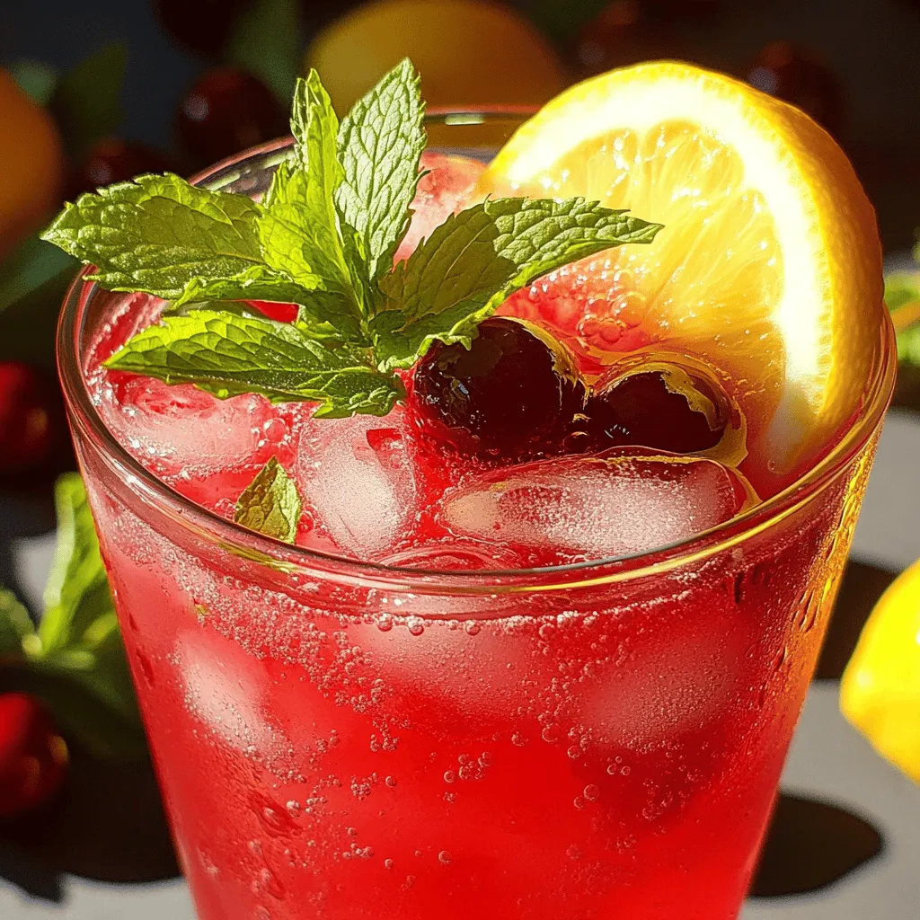 ![To make the Cherry Lemonade Cooler, you need a few fresh and tasty ingredients. Here’s the list: - 1 cup fresh cherries, pitted and halved - 1 cup fresh lemon juice (about 4–6 lemons) - 1/2 cup honey or agave syrup (adjust to taste) - 4 cups sparkling water (or club soda) - Fresh mint leaves for garnish - Lemon slices for garnish - Ice cubes Using fresh ingredients is key to a bright and tasty drink. Look for plump, ripe cherries with a deep color. Fresh lemons should feel heavy for their size and have a bright yellow skin. When it comes to honey or agave syrup, choose organic varieties for the best flavor. You can customize your Cherry Lemonade Cooler, too. If you want a sweeter drink, add more honey or agave. For a tart flavor, use less sweetener or more lemon juice. You could also try adding other fruits like strawberries or raspberries for a fun twist. When you gather your ingredients, think about quality. Fresh, local produce often tastes better and supports local farmers. Now you have everything you need to create a refreshing Cherry Lemonade Cooler! For the full recipe, refer to the earlier section. To make your Cherry Lemonade Cooler, let's get right into the steps. 1. Blend the Cherries: Start by placing the fresh cherries and honey or agave syrup in your blender. Blend these until they are smooth. If you want a finer drink, you can strain the mixture. This removes any pulp and makes the drink silky. 2. Mix with Lemon Juice: Next, pour the cherry blend into a large pitcher. Add your fresh lemon juice to this mixture. Stir it well to ensure the flavors mix together nicely. 3. Add Sparkling Water: Slowly pour in the sparkling water. It’s important to mix it gently. This helps keep the bubbles and fizz in your drink. 4. Prepare the Glasses: Fill each glass with ice cubes. This keeps your drink cold and refreshing. 5. Pour and Garnish: Now, pour your cherry lemonade mixture over the ice in each glass. For a beautiful finish, add a few mint leaves and a slice of lemon to each glass. 6. Serve Immediately: Your refreshing Cherry Lemonade Cooler is ready to enjoy! Serve it right away to keep it bubbly and fresh. This recipe takes just 10 minutes from start to finish. You will have a vibrant drink that serves four people. Enjoy this simple and delicious Cherry Lemonade Cooler with friends or family. For more details, check the Full Recipe. To make your Cherry Lemonade Cooler just right, start with sweetness. Adjust honey or agave syrup to your taste. If it’s too sweet, add more lemon juice. This will balance the flavor. When blending, combine the cherries and sweetener well. If you want a smoother drink, strain it. This removes bits of pulp and skins. It gives you a nice texture. For serving, keep your cooler cold. Chill your glasses in the fridge before use. This makes each sip refreshing. You can also add ice cubes to glasses. Pour the drink over the ice for a frosty treat. If you want a fun touch, use clear glassware. This shows off the pretty color. Add a slice of lemon or mint leaves for a pop. It makes your drink look inviting. For a boost, serve the cooler with a straw. This makes sipping easier and more fun. Enjoy your drink with friends or family. It’s perfect for hot days! Try the Full Recipe to create your own Cherry Lemonade Cooler. {{image_2}} You can easily change the flavor of your Cherry Lemonade Cooler. Here are some fun ideas: - Different Fruits: Add fresh strawberries, raspberries, or blueberries. These fruits mix well with cherries and lemons. You get a colorful drink that's even more delicious. - Alcoholic Versions: For a fun twist, add vodka or rum. Mix one part alcohol with three parts of the cherry lemonade. This makes a great party drink. - Mocktail Adaptations: If you want a non-alcoholic option, try using soda or tonic water instead of sparkling water. This keeps it bubbly and refreshing without the alcohol. - Seasonal Variations: Use fresh peaches or watermelon in summer. In winter, try adding spices like cinnamon or ginger for a warm twist. You can also use frozen fruit when fresh options are out of season. Frozen cherries or lemons work just as well and keep your drink cool. Feel free to experiment! Each change makes your drink unique and fun. Check out the Full Recipe for the base you can customize. To keep your Cherry Lemonade Cooler tasty, store leftovers in the fridge. Use an airtight container for best results. This helps keep flavors fresh and prevents spills. If you want to maintain carbonation in your sparkling water, only mix in the sparkling water when you are ready to serve. This keeps the fizz alive and makes each sip refreshing. If you plan to make this drink in advance, prepare the cherry and lemon mixture first. Store it in the fridge without the sparkling water. When you are ready to serve, add the sparkling water and ice. This method keeps your cooler bubbly and delicious. For the full recipe, check out the [Full Recipe]. How can I make a non-sweet version? To create a non-sweet Cherry Lemonade Cooler, skip the honey or agave syrup. You can also add more lemon juice or sparkling water to balance the flavors. This gives a tart and refreshing taste without the added sweetness. What if I don’t have fresh lemons or cherries? If fresh lemons or cherries are not available, use bottled lemon juice and frozen cherries. The flavor will still be pleasant, but fresh fruit provides the best taste. Frozen cherries blend well and add a nice chill to the drink. Can I use bottled lemon juice or frozen cherries? Yes, bottled lemon juice is fine in a pinch. Just be sure to choose a brand with no added sugars. Frozen cherries are also a great option. They are convenient and have a good flavor when blended. You might need to adjust the quantity slightly since they can be sweeter than fresh cherries. For the full recipe, check the details above. Enjoy making your Cherry Lemonade Cooler! You now have all the tools to create a perfect cherry lemonade
