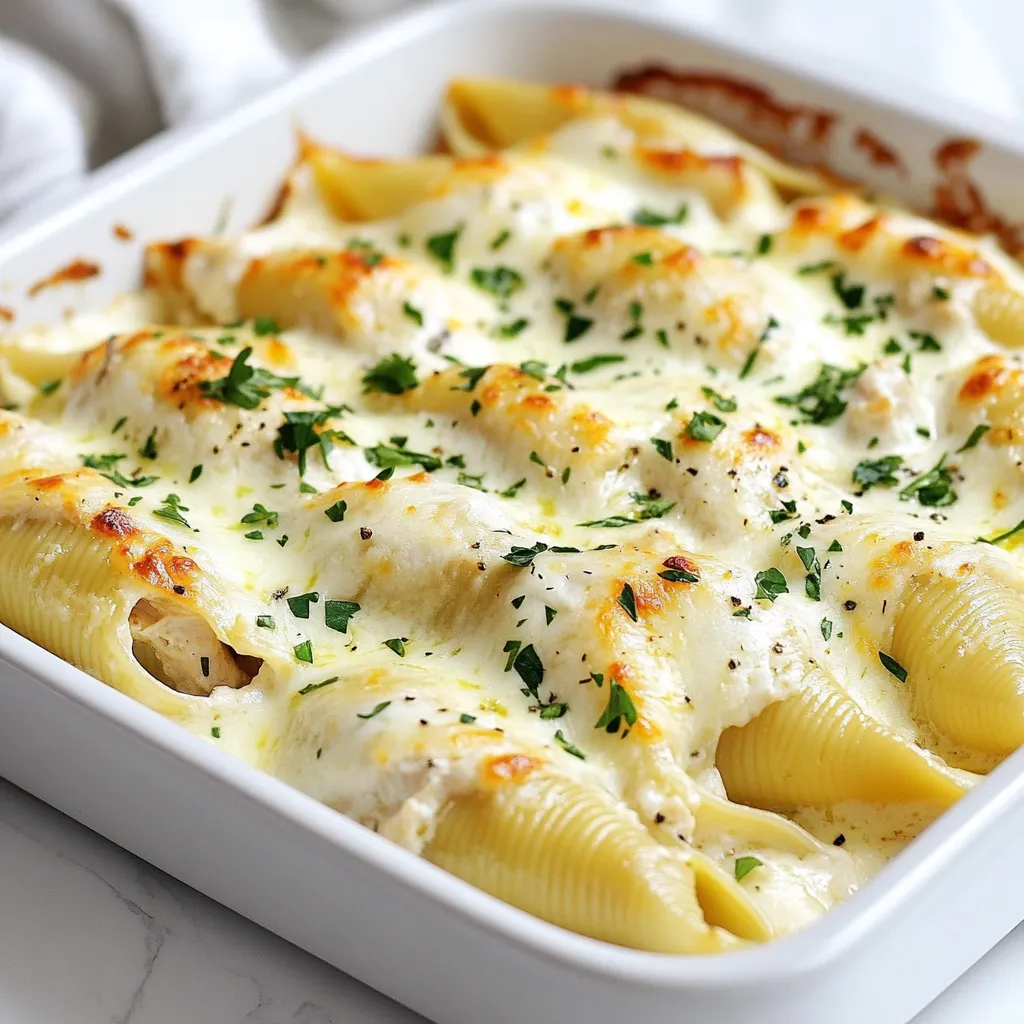 Delicious jumbo pasta shells filled with a creamy chicken and cheese mixture, topped with Alfredo sauce and baked to perfection.