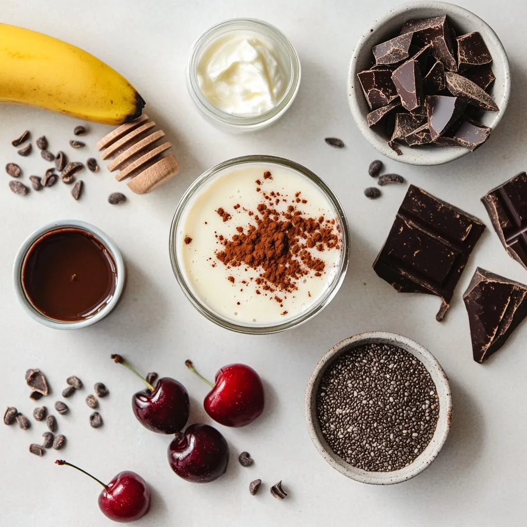 To start, gather your ingredients. You need frozen cherries, a frozen banana, almond milk, cocoa powder, chia seeds, honey or maple syrup, and vanilla extract. If you want it creamier, get Greek yogurt too.