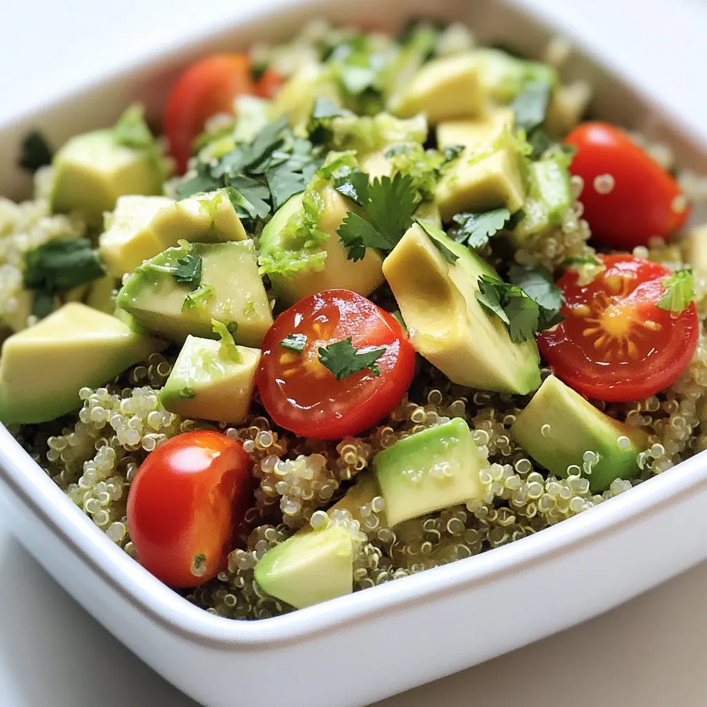 Finally, garnishing with diced avocado and cherry tomatoes adds color and freshness. The creamy avocado complements the quinoa perfectly.