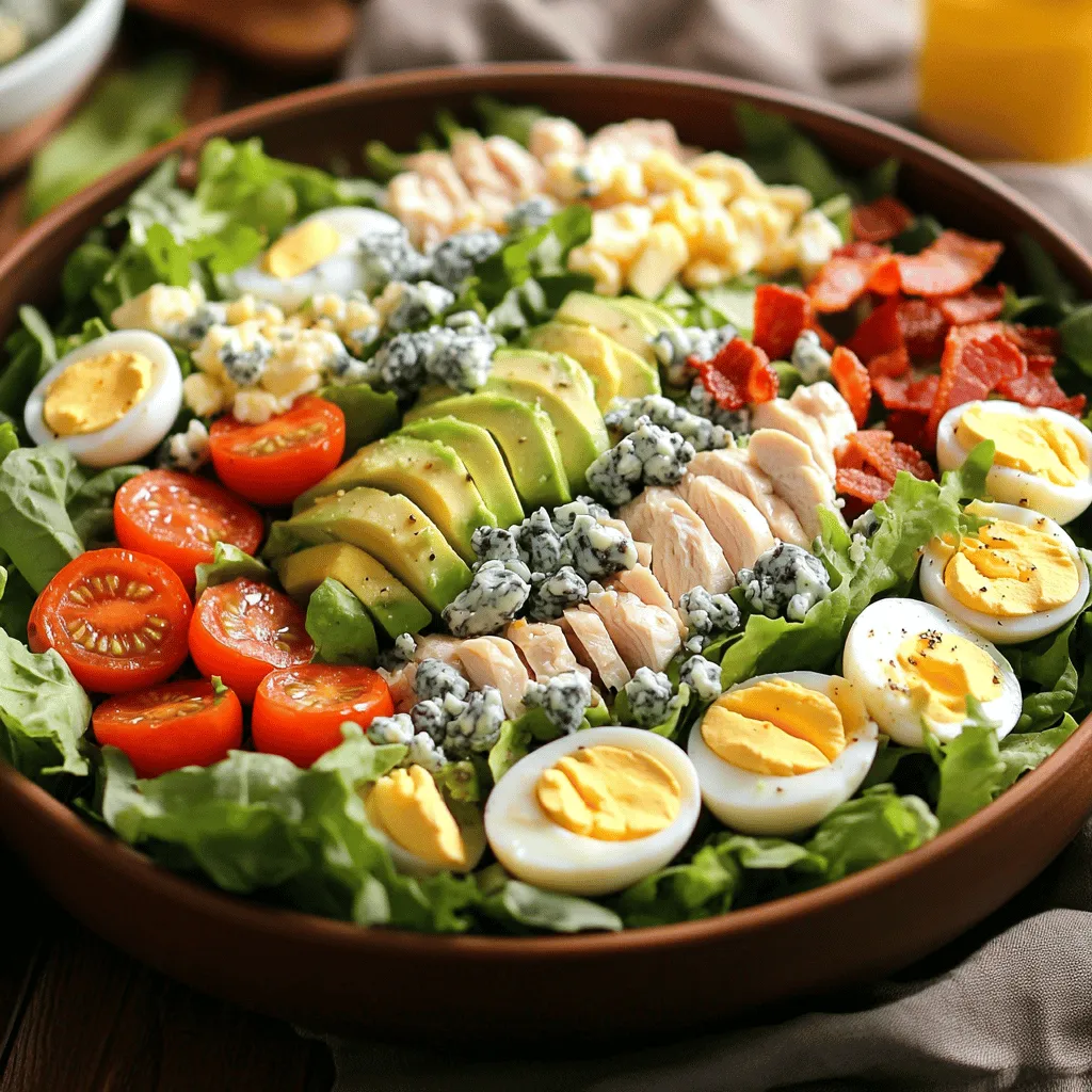 A Classic Cobb Salad features fresh and vibrant ingredients. You start with greens like romaine, arugula, and spinach. These give a nice crunch and a healthy boost. Next, you add proteins, which often include cooked chicken breast and hard-boiled eggs. For creaminess, diced avocado is a must. Cherry tomatoes bring a burst of sweetness, while crumbled blue cheese adds a salty kick. Finally, crispy bacon or chickpeas provide a satisfying crunch. All these come together with a simple dressing made of olive oil, vinegar, and Dijon mustard.