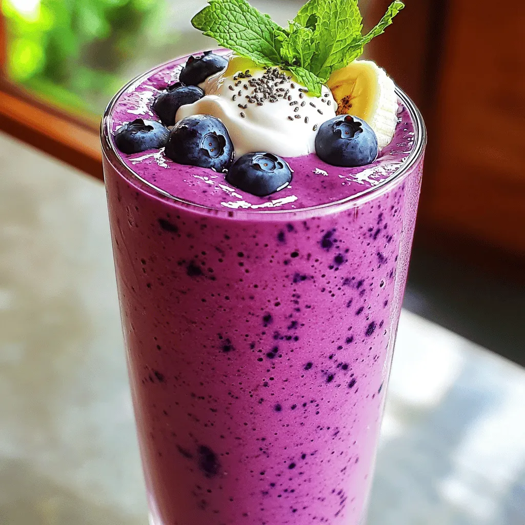 ![For a Coconut Blueberry Smoothie, gathering the right ingredients is key. Here's what you need: - 1 cup fresh or frozen blueberries - 1 cup coconut milk (or any non-dairy milk of your choice) - 1 banana, sliced - 1 tablespoon chia seeds - 1 tablespoon honey or maple syrup (optional for extra sweetness) - 1/2 cup Greek yogurt (or a non-dairy yogurt) - Ice cubes (optional, for a thicker consistency) - Fresh mint leaves for garnish Using fresh blueberries gives the best flavor. However, frozen ones work well too. Coconut milk adds a creamy texture. If you prefer non-dairy options, almond or oat milk can also be delicious. Bananas add natural sweetness and creaminess. They also help to thicken the smoothie. Chia seeds are great for extra nutrition. They are rich in omega-3 fatty acids and fiber. If you want a sweeter smoothie, honey or maple syrup can heighten the taste. Greek yogurt makes the drink creamy and adds protein. You can swap it for non-dairy yogurt if needed. Ice cubes can make your smoothie thicker and colder, which is perfect for hot days. To finish, fresh mint leaves add a nice touch. They give a pop of color and a refreshing taste. Now that you have the ingredients, you can move on to making this tasty treat. For the full recipe, check out the [Full Recipe]. To make the Coconut Blueberry Smoothie, follow these simple steps. - Step 1: Combine ingredients in a blender. Start by adding 1 cup of fresh or frozen blueberries, 1 cup of coconut milk, and 1 sliced banana. Also, add 1 tablespoon of chia seeds and 1/2 cup of Greek yogurt. If you want it sweeter, include 1 tablespoon of honey or maple syrup. - Step 2: Adjust thickness with ice cubes. If you like your smoothie thick, toss in some ice cubes. This will make it cold and refreshing. - Step 3: Blend until smooth and creamy. Blend the mixture on high speed for about 30 to 45 seconds. Keep blending until it's nice and smooth, with no chunks left. - Step 4: Taste and adjust sweetness as needed. After blending, take a quick taste. If you want it sweeter, feel free to add more honey or syrup. Blend again for a few seconds to mix it in. - Step 5: Serve and garnish. Pour the smoothie into glasses. Add fresh mint leaves on top for a lovely touch. This makes it look great and adds some flavor. Enjoy this Coconut Blueberry Smoothie as a tasty treat! For the complete recipe, check out the Full Recipe section. To make your smoothie smooth, use a high-speed blender. This helps blend all the ingredients well. Start with your liquids first. This allows the blades to move freely. Then, add the solid ingredients. Using ripe bananas is key. Ripe bananas make your smoothie sweet and creamy. They blend easily and give great flavor. If your bananas are not ripe, your smoothie may taste bland. To avoid splattering, secure the lid tightly. You can also cover the lid with a kitchen towel. This gives extra protection. Start blending on a low speed first. Gradually increase the speed to high. You may want to adjust the sweetness of your smoothie. Taste before serving. If it’s not sweet enough, add more sweetener. Natural sweeteners like honey or maple syrup work well. You can also use agave syrup. For a healthier option, try mashed dates. Each sweetener adds a different flavor. Choose what you love best. If you want a sugar-free option, use ripe bananas. They add natural sweetness without extra sugar. You can also skip the sweetener altogether if you prefer. For the full recipe, check out the details above. Enjoy your tasty and refreshing coconut blueberry smoothie! {{image_2}} You can boost your coconut blueberry smoothie with protein. Adding protein powder is a simple choice. It blends well and gives you extra energy. Use a scoop of your favorite flavor, like vanilla or chocolate. Another option is nut butter. Almond or peanut butter adds creaminess and flavor. Just a tablespoon makes your smoothie rich and satisfying. Plus, you'll get healthy fats and protein. This makes the drink more filling. Blueberries are great, but you can mix in other fruits too. Try strawberries, raspberries, or mango for a fresh twist. Each fruit adds its own flavor and nutrients. You can even blend in some spinach for a green boost. Seasonal fruits are perfect for variety. In the summer, use peaches or watermelon. In the fall, add apples or pears. This keeps your smoothie exciting and lets you enjoy what's fresh. For the full recipe, check out the section above. To keep your leftover coconut blueberry smoothie fresh, pour it into an airtight container. This helps prevent air from spoiling it. Place the container in the fridge. It will stay fresh for about one day. If you want to freeze the smoothie, pour it into ice cube trays. Once frozen, you can pop the cubes into a bag. This way, you can enjoy your smoothie later. You should drink stored smoothies within 24 hours for the best taste. If you freeze it, consume the cubes within one month. Signs that your smoothie has gone bad include a sour smell or change in color. If it looks or smells off, it’s best to throw it away. Enjoy your Coconut Blueberry Paradise Smoothie fresh for the best flavor! For the full recipe, check out the earlier section. To make this smoothie vegan, use non-dairy yogurt and coconut milk. Replace honey with maple syrup or agave. This keeps the drink plant-based while still tasting great. Yes, you can swap coconut milk for almond, soy, or oat milk. Choose your favorite non-dairy milk. Each option changes the flavor slightly, so pick what you like best. This smoothie is very healthy. It has antioxidants from blueberries, fiber from chia seeds, and healthy fats from coconut. Greek yogurt adds protein, which helps keep you full and energized. To lower the calorie count, skip the sweetener. Use low-fat or non-dairy yogurt. You can also reduce the amount of banana for fewer calories. These changes still keep it tasty and satisfying. For the full recipe, check the section above! This blog post covered