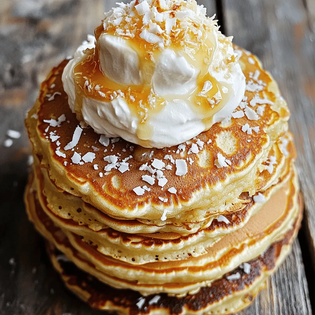 Buttermilk gives the pancakes a rich flavor and a tender texture. Eggs bind the batter and provide moisture. Vanilla adds a warm aroma, making each bite delightful. Shredded coconut adds chewiness and a tropical taste. Unsweetened coconut cream brings a creamy richness that mimics the pie.