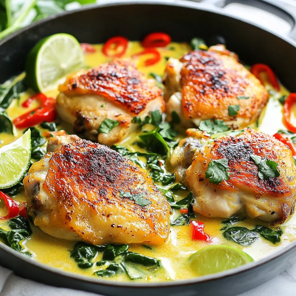 A delicious skillet dish featuring chicken thighs cooked in a creamy coconut lime sauce with fresh vegetables.