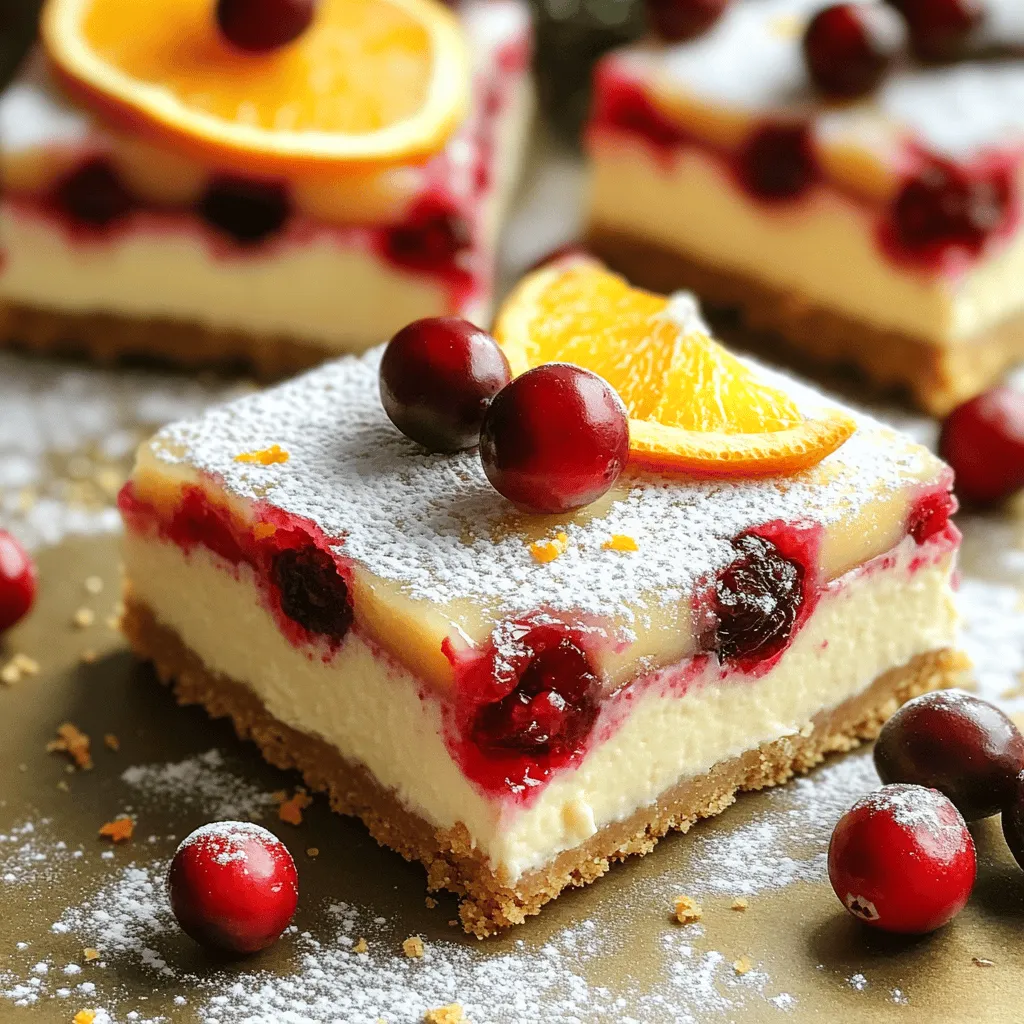 Garnish your cheesecake bars for a stunning look. Dust the tops with powdered sugar for a snowy touch. Add a few whole cranberries and a slice of orange on top. This makes your bars pop and look festive.