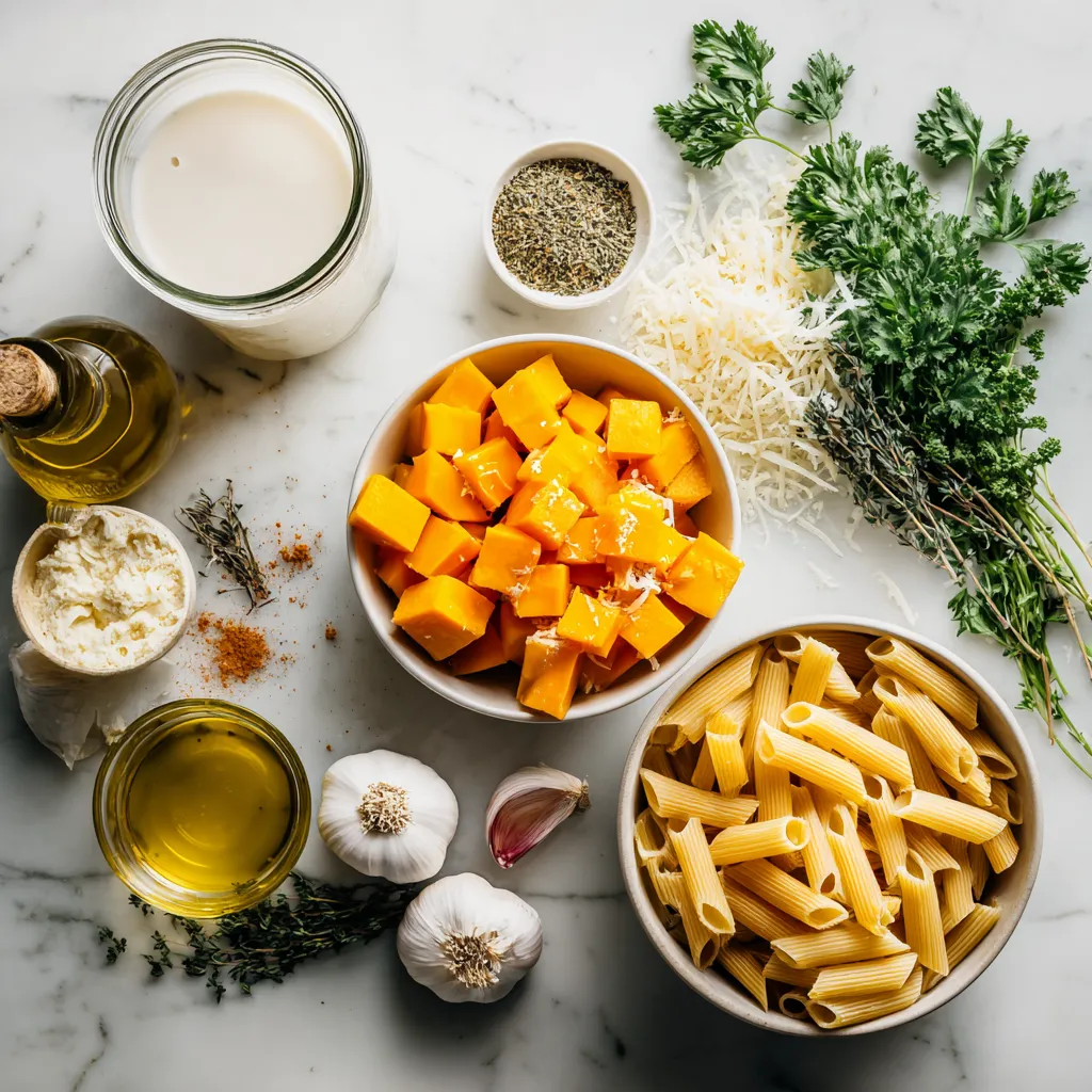 For a delicious creamy butternut squash penne, gather these simple ingredients: