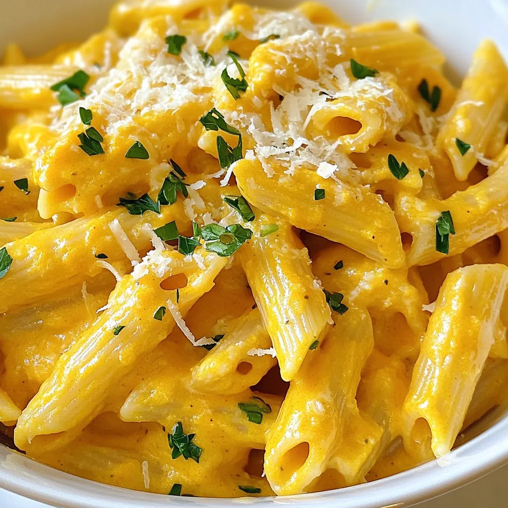 Plate the creamy butternut squash penne in bowls, garnishing with fresh parsley and grated Parmesan cheese if desired.
