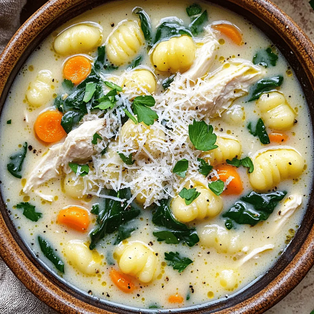 ![- 1 pound boneless, skinless chicken breast, diced - 1 tablespoon olive oil - 1 medium onion, chopped - 3 garlic cloves, minced - 2 carrots, diced - 2 celery stalks, diced - 1 teaspoon dried thyme - 1 teaspoon Italian seasoning - 4 cups chicken broth - 1 pound potato gnocchi - 1 cup heavy cream - 2 cups fresh spinach - Salt and pepper to taste - Grated Parmesan cheese, for serving - Fresh parsley, for garnish To get started, you need to measure your ingredients. For the chicken, cut it into small, even pieces. This way, it cooks faster and evenly. Chop the onion, carrots, and celery into small bits. Mince the garlic finely. Using a sharp knife makes this easier. Make sure all your ingredients are ready before cooking. This will help you move smoothly through the steps. You can swap some ingredients if you wish. For the chicken, try turkey or even tofu for a veggie option. Use vegetable broth instead of chicken broth for a lighter taste. If you lack heavy cream, coconut milk works well. You can also mix in any greens you like instead of spinach. Kale or Swiss chard can add a nice twist. For the gnocchi, you can use pasta if that’s what you have. Just adjust the cooking time based on what you choose. This recipe is flexible, so feel free to make it your own! Check the Full Recipe for more details. Gather all your ingredients before you start. This makes the process smooth. You will need: - 1 pound boneless, skinless chicken breast, diced - 1 tablespoon olive oil - 1 medium onion, chopped - 3 garlic cloves, minced - 2 carrots, diced - 2 celery stalks, diced - 1 teaspoon dried thyme - 1 teaspoon Italian seasoning - 4 cups chicken broth - 1 pound potato gnocchi - 1 cup heavy cream - 2 cups fresh spinach - Salt and pepper to taste - Grated Parmesan cheese, for serving - Fresh parsley, for garnish Start by washing and chopping the vegetables. Dice the chicken into small pieces. This helps it cook evenly. 1. Heat the olive oil in a large pot over medium heat. Once hot, add the diced chicken. Season it with salt and pepper. Cook until it turns white, around 5-7 minutes. Remove the chicken and set it aside. 2. In the same pot, add the chopped onion, carrots, and celery. Cook for 5-6 minutes. Stir often until the veggies soften. 3. Next, add the minced garlic, dried thyme, and Italian seasoning. Cook for one more minute. The kitchen will smell amazing! 4. Now, pour in the chicken broth. Bring it to a boil. Add the potato gnocchi. Cook them until they float to the top, usually 3-5 minutes. 5. Lower the heat. Stir in the heavy cream and fresh spinach. Return the chicken to the pot. Let it simmer for 5 minutes. This warms everything through. 6. Taste the soup. Add salt and pepper if needed. 7. Serve hot. Top each bowl with grated Parmesan cheese and fresh parsley. - Use a sharp knife for cutting vegetables. This makes prep easier. - Don’t rush the cooking of the chicken. Make sure it’s fully cooked for safety. - Stir the soup gently when you add the gnocchi. This helps them stay intact. - Taste as you go. Adjust seasoning to fit your taste. - Make it your own! You can add more veggies or herbs if you like. Follow these steps for a creamy chicken gnocchi soup that warms your heart. For the full recipe, refer back to the ingredients list. Enjoy every bite! To make your creamy chicken gnocchi soup shine, follow these tips: - Cook chicken thoroughly: Ensure the chicken is cooked until no longer pink. This keeps it safe to eat. - Sauté vegetables well: Sautéing the onions, carrots, and celery adds depth to the flavor. Aim for tenderness and a bit of caramelization. - Use fresh spinach: Fresh spinach wilts nicely and adds vibrant color. Stir it in just before serving. - Monitor the broth: Keep an eye on the chicken broth. Adding it gradually helps control the soup's thickness. Even the best cooks can make mistakes. Here are some common ones: - Overcooking gnocchi: Gnocchi cooks quickly. When they float, they are done. Cooking them longer can make them mushy. - Neglecting seasoning: Don’t forget to taste and adjust salt and pepper. Each ingredient needs balance. - Adding cream too soon: Stir in the cream at low heat. Adding it too early can cause curdling. Want to take your soup to the next level? Consider these ideas: - Add herbs: Fresh herbs like basil or thyme can brighten the dish. Sprinkle them just before serving. - Spice it up: If you like a kick, add a pinch of red pepper flakes. It adds warmth without overwhelming the soup. - Finish with cheese: Grated Parmesan adds richness. It melts nicely into the soup, enhancing every spoonful. For the complete creamy chicken gnocchi soup experience, check out the Full Recipe. {{image_2}} You can easily make a creamy gnocchi soup without meat. Swap the chicken for mushrooms. Use 1 pound of diced mushrooms for a rich, earthy flavor. You can also add tofu for extra protein. It absorbs the flavors well and adds a nice texture. Use vegetable broth instead of chicken broth for a full vegetarian experience. If you want different proteins, try shrimp or sausage. Shrimp cooks quickly and brings a sweet taste. Use about 1 pound of peeled shrimp. For sausage, choose Italian sausage for a spicy kick. Cook it first, then add it to the soup. You can also use shredded rotisserie chicken. It saves time and adds great flavor. Mix in seasonal veggies for variety. In spring, add peas or asparagus. In summer, zucchini and corn brighten the soup. In fall, use squash or pumpkin for a cozy feel. In winter, root vegetables like parsnips or turnips add heartiness. Each season brings unique flavors, making the soup exciting year-round. Don't forget to check the Full Recipe for further details. To store leftover creamy chicken gnocchi soup, let it cool first. Pour the soup into an airtight container. It will stay fresh in the fridge for up to three days. If you want to keep it longer, consider freezing it. Reheat your creamy chicken gnocchi soup on the stove. Pour the soup in