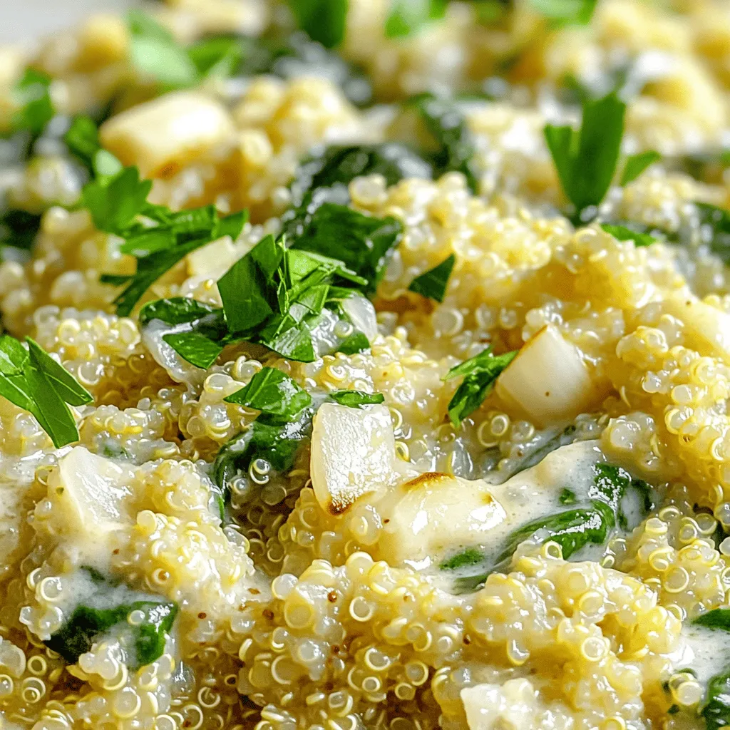 To make Creamy Garlic Parmesan Quinoa, start with your main ingredients. Rinsing the quinoa helps remove any bitterness. Using vegetable broth adds depth to the flavor. The olive oil will add richness as you cook.