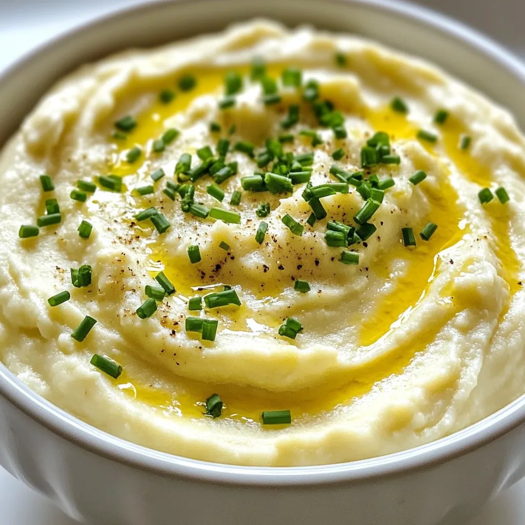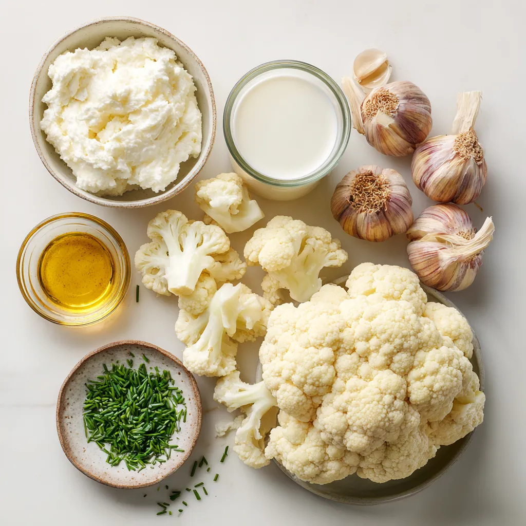 These three ingredients are key to our creamy mash. Cauliflower gives a light texture. Garlic adds a rich, roasted flavor. Olive oil helps bring everything together.