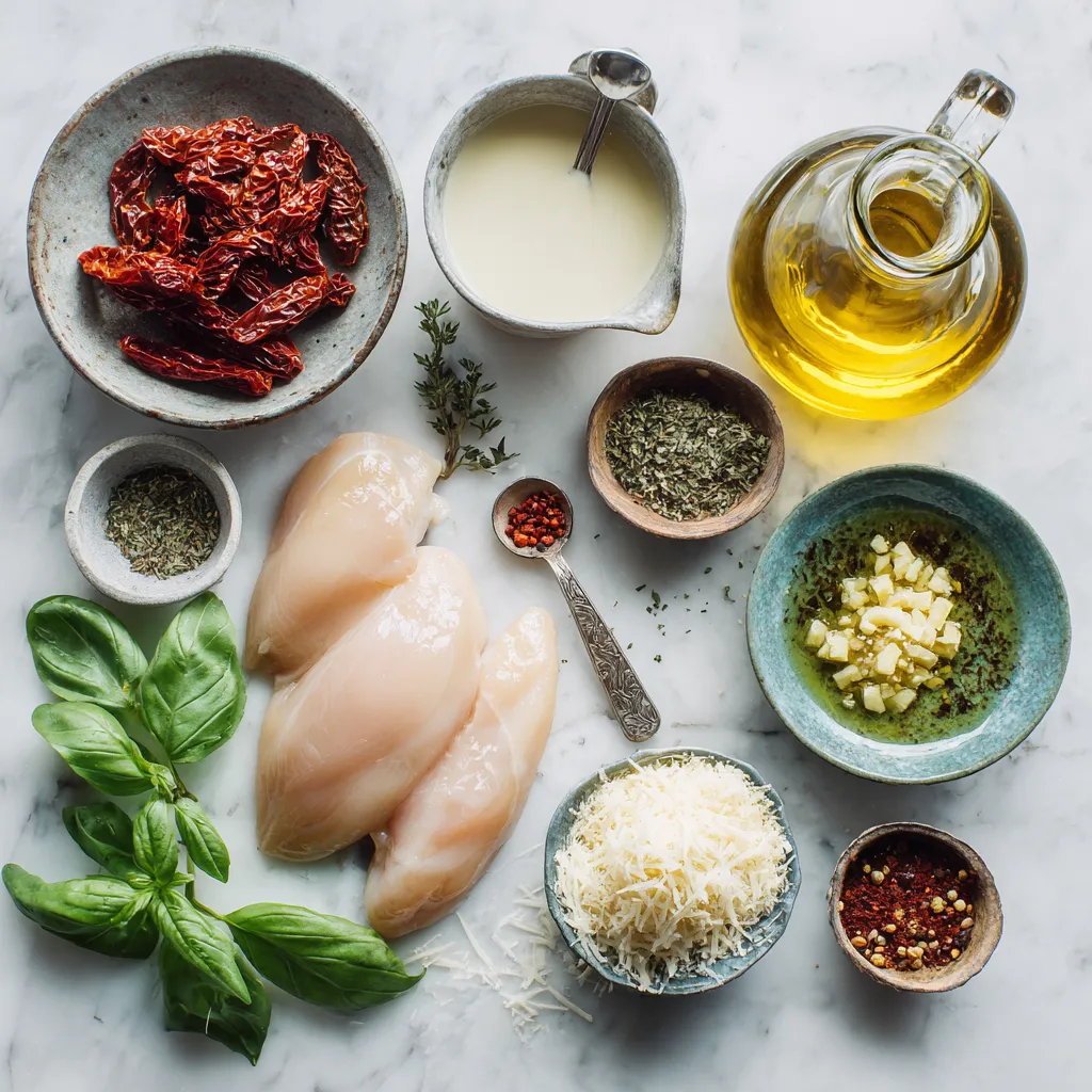 To make creamy sun-dried tomato chicken, you need simple yet tasty ingredients. The chicken breasts are the main part of this dish. They are juicy and cook well in the skillet. Sun-dried tomatoes add a rich flavor that shines through the creamy sauce. Heavy cream gives the dish its lovely texture, making each bite smooth and rich.