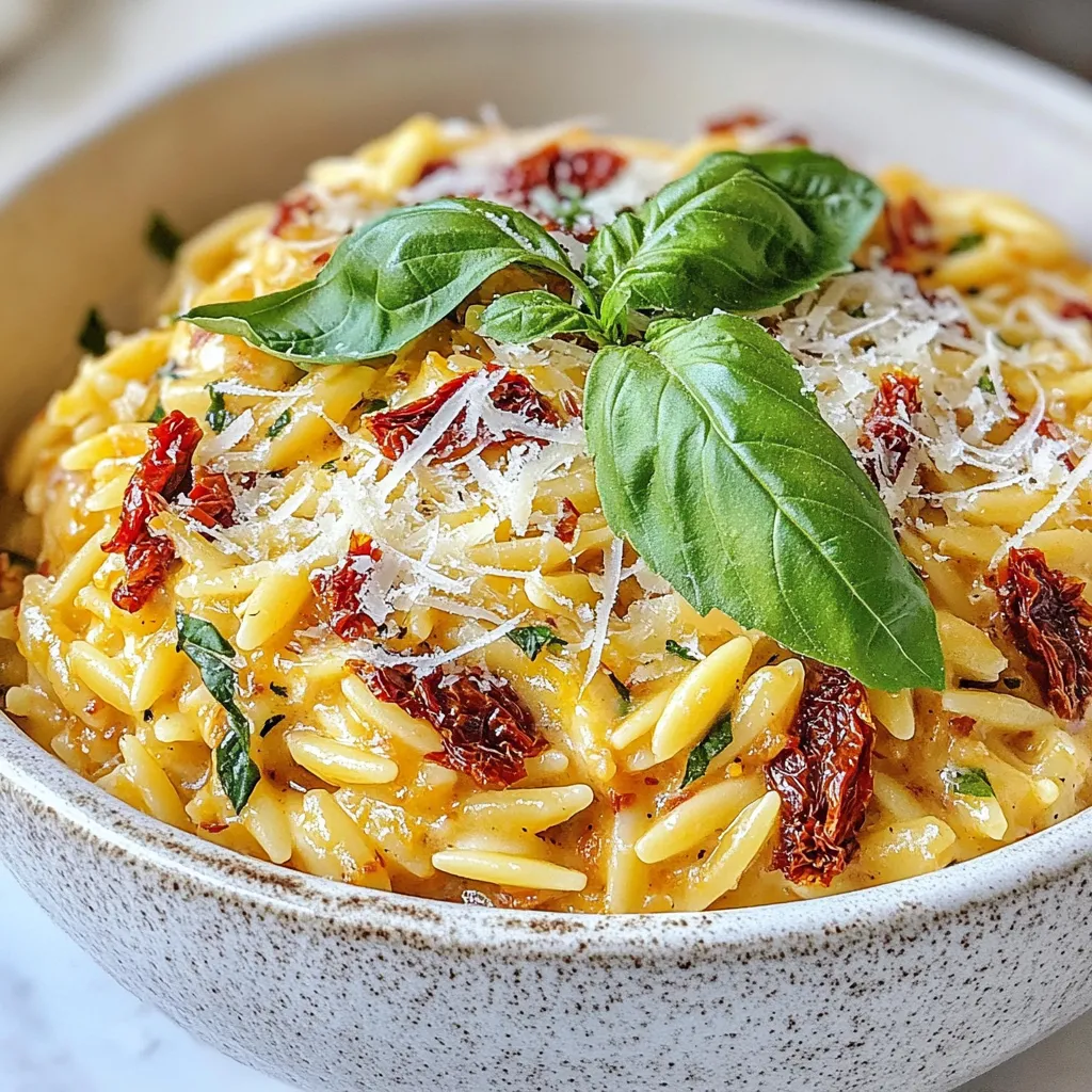 A delicious and creamy orzo pasta dish with sun-dried tomatoes and Parmesan cheese.