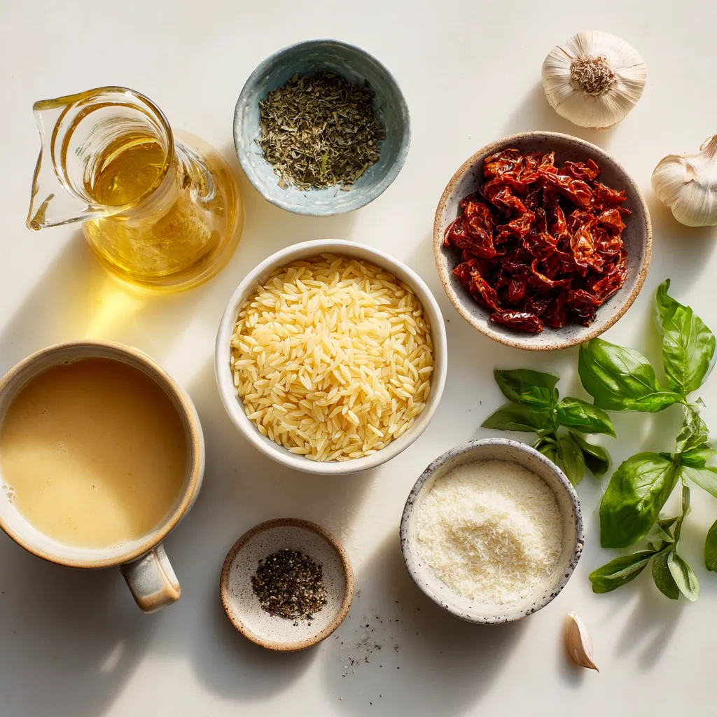 These main ingredients create a rich base for the dish. The orzo pasta adds texture while the sun-dried tomatoes bring a tangy kick. Heavy cream makes everything creamy, and Parmesan adds a savory depth.