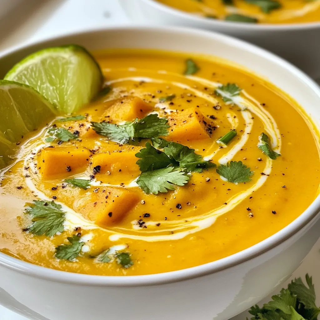 A rich and creamy soup made with sweet potatoes, coconut milk, and spices, garnished with fresh cilantro and lime.