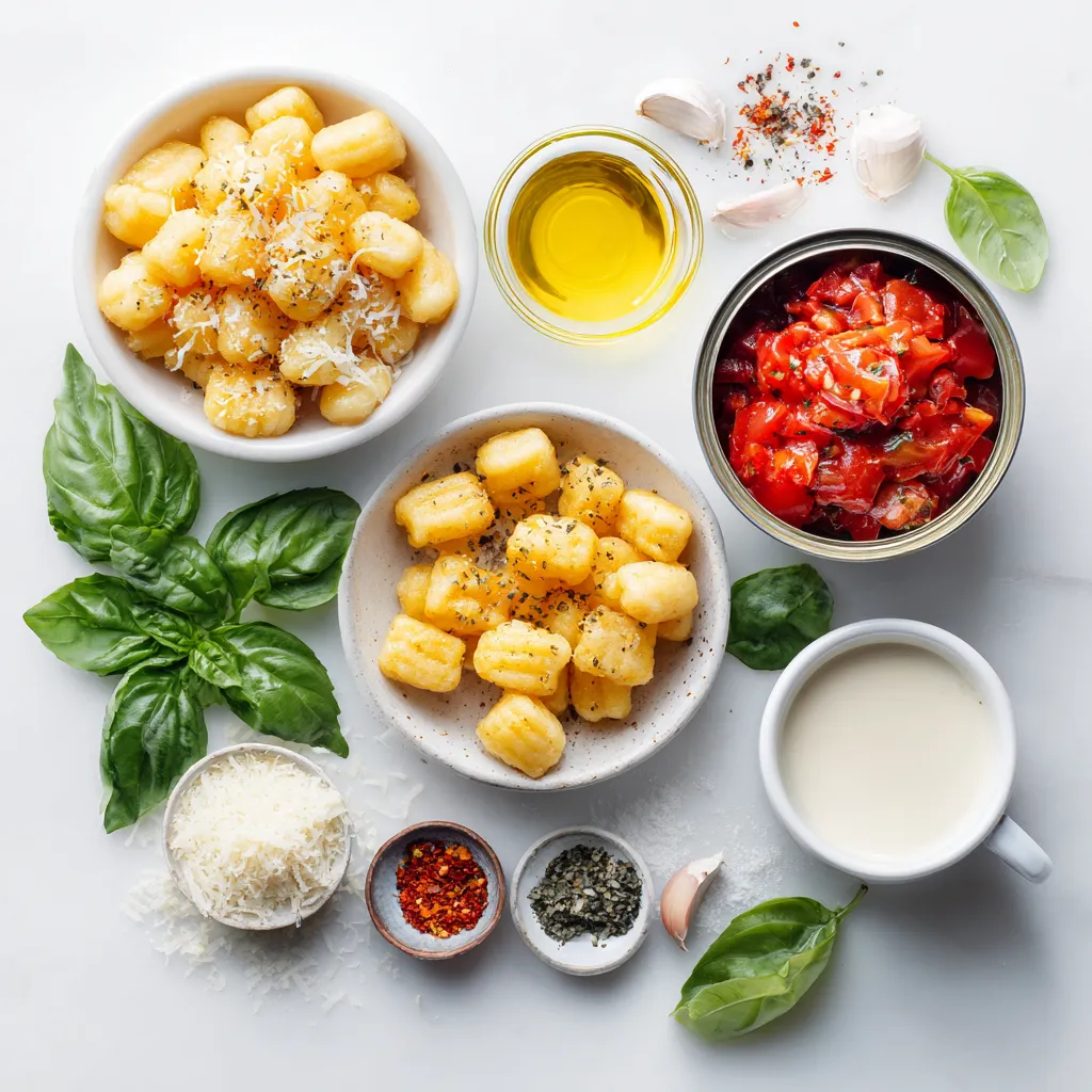 The main ingredients in creamy tomato basil gnocchi create a lovely harmony of flavors. The potato gnocchi gives a soft and fluffy texture that pairs perfectly with the creamy sauce. I love using high-quality olive oil to sautΓ© the garlic. This adds a rich base for flavor. Fresh garlic brings a bold taste to the dish. Diced tomatoes add a sweet and tangy touch, while heavy cream makes the sauce rich and smooth. Finally, fresh basil adds a vibrant aroma and a touch of green.