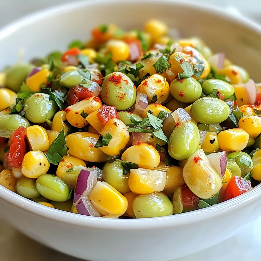 A vibrant and healthy dish featuring edamame, sweet corn, and bell peppers, perfect as a side or light main.