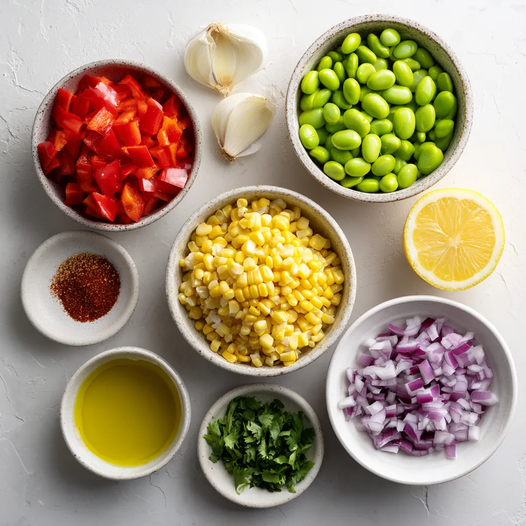 Start by gathering your ingredients. You will need edamame, corn, bell pepper, onion, and garlic. If you use frozen edamame and corn, thaw them quickly under running water. Drain them well and set them aside. Next, dice the red bell pepper and finely chop the onion and garlic. This prep makes cooking easy and fun.