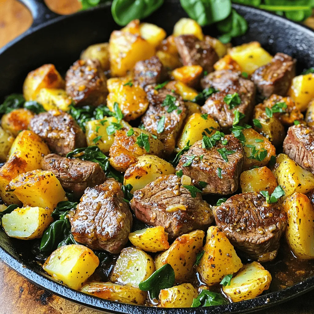 – Finally, combine the steak, potatoes, and spinach. Toss everything together to coat in the garlic butter sauce. Enjoy the rich flavors!