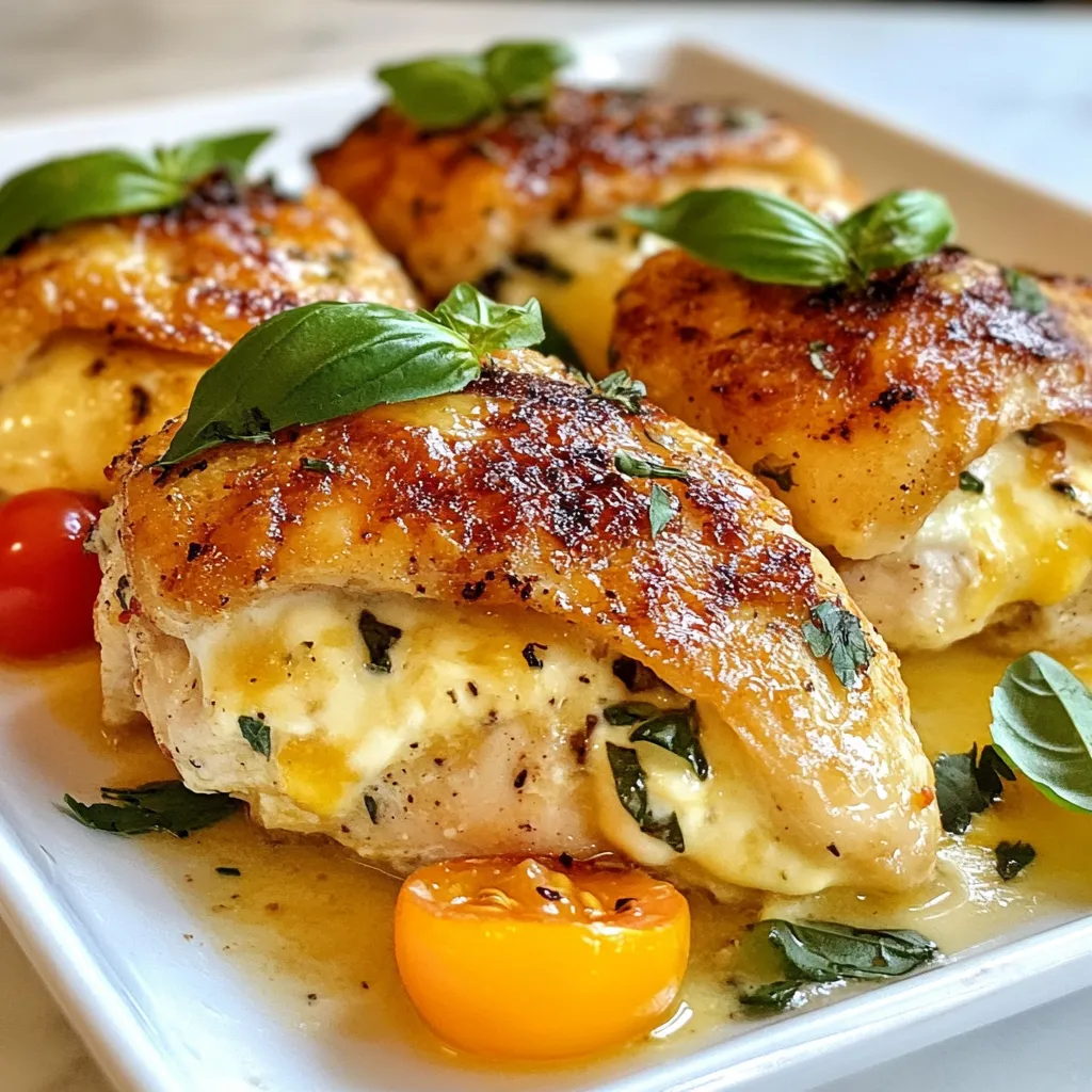Serve the chicken on a platter, garnished with fresh basil leaves and the roasted cherry tomatoes. Drizzle with a bit of olive oil for an elegant finish.