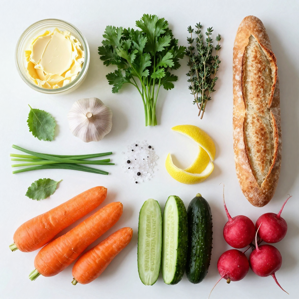 A delicious spread of garlic herb butter served with crusty baguette and fresh vegetables.