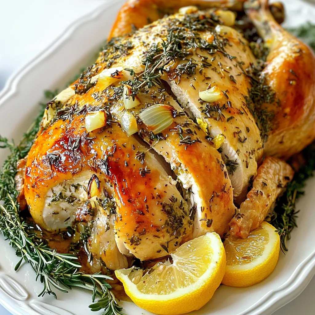 A flavorful roasted turkey infused with garlic and fresh herbs, perfect for holiday gatherings.