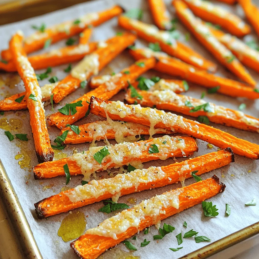 I spread the carrot fries out on the baking sheet in one layer. I bake them for 20 minutes. When the time is up, I take the baking sheet out of the oven. I sprinkle 1/2 cup of grated Parmesan cheese over the fries. Then, I put them back in the oven for another 10 to 15 minutes. I watch closely until they turn golden brown and crispy. Lastly, I take them out and let them cool a bit. I like to garnish with chopped parsley for a fresh touch.