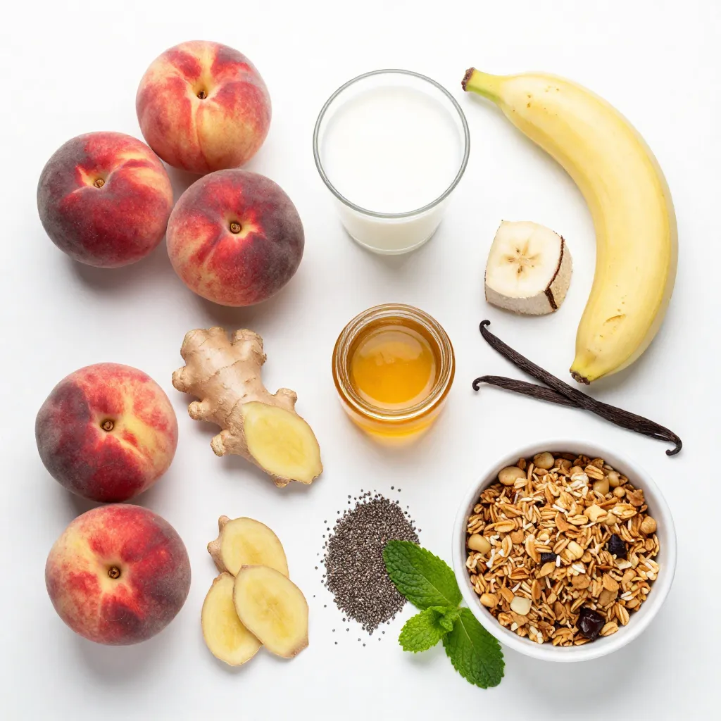 Place all the prepared ingredients in a blender. Add the chopped peaches, frozen banana, coconut milk, grated ginger, honey or maple syrup, and vanilla extract. Blend on high speed until the mix is smooth and creamy. If it’s too thick, pour in a bit more coconut milk. Blend again until you reach your desired thickness. Once blended, taste it! If you want it sweeter, add more honey or syrup.