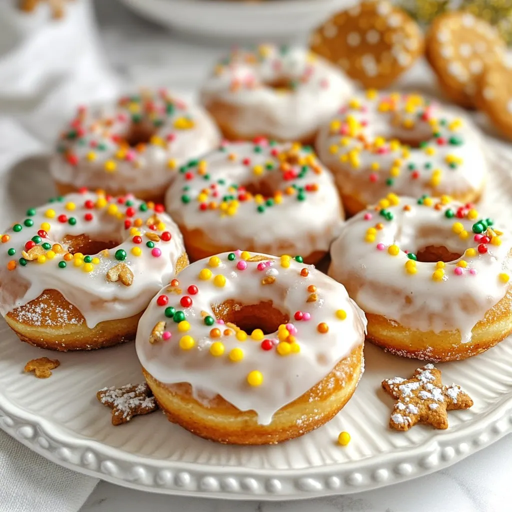 Dip the cooled donuts into the glaze, then sprinkle with your favorite toppings such as festive sprinkles or crushed gingerbread cookies.