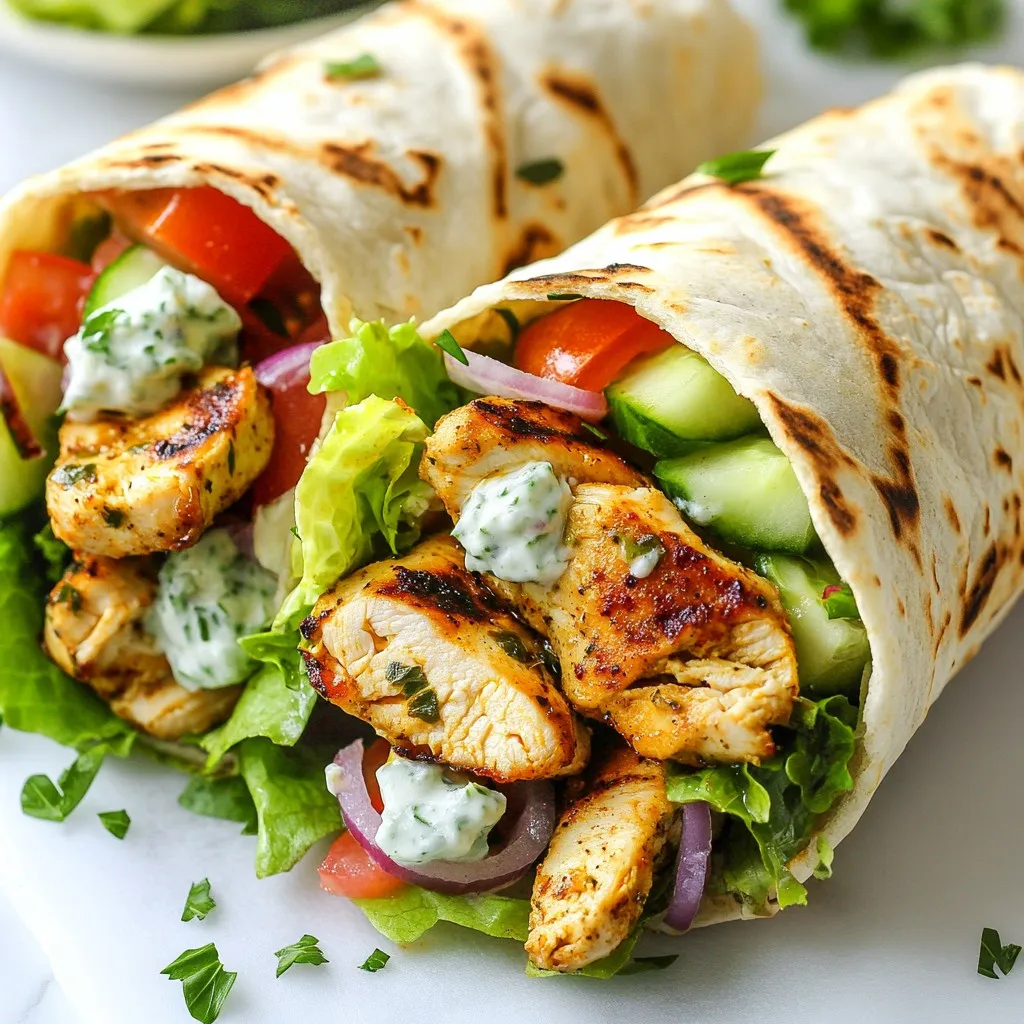 Delicious wraps filled with marinated grilled chicken and fresh vegetables, served with tzatziki sauce.