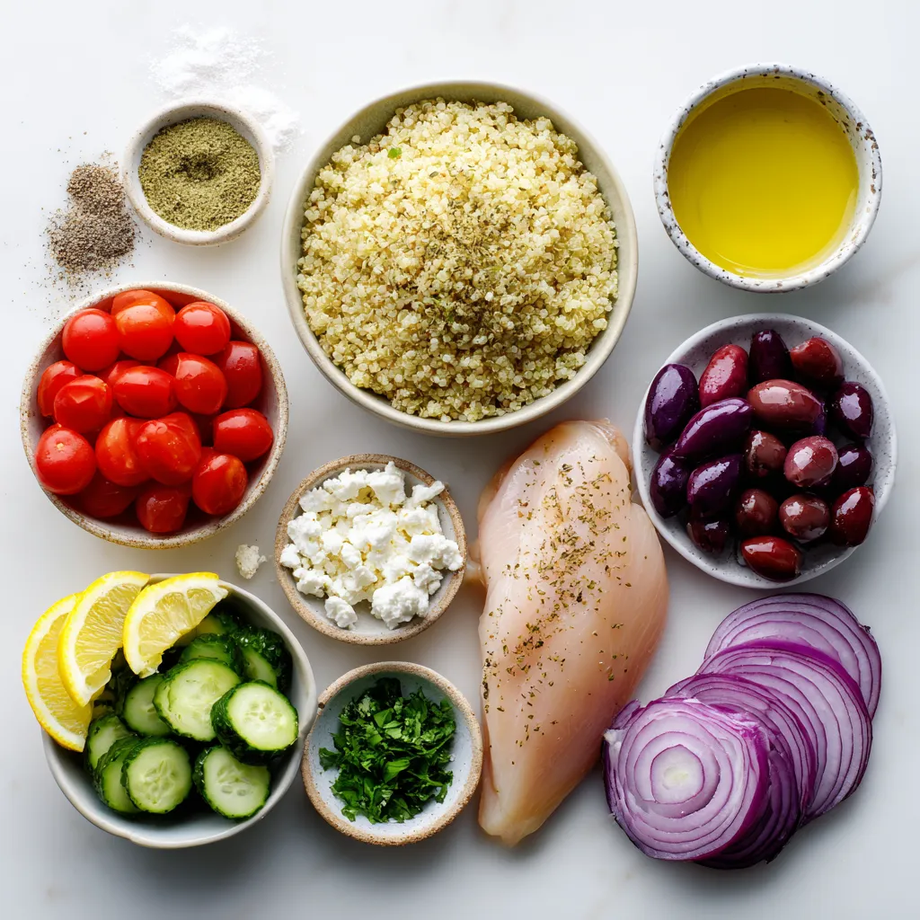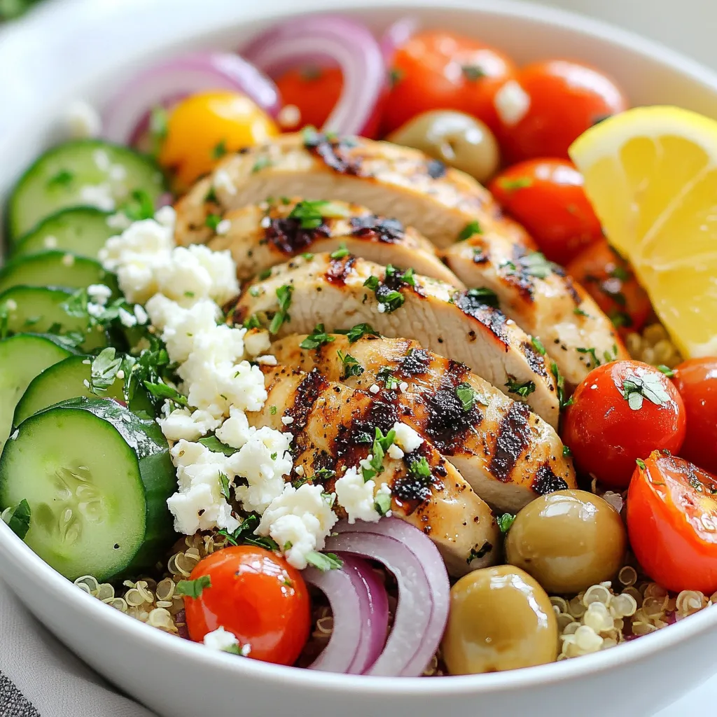 In bowls, start with a base of cooked quinoa. Top with sliced chicken, cherry tomatoes, cucumber, red onion, olives, and crumbled feta cheese.