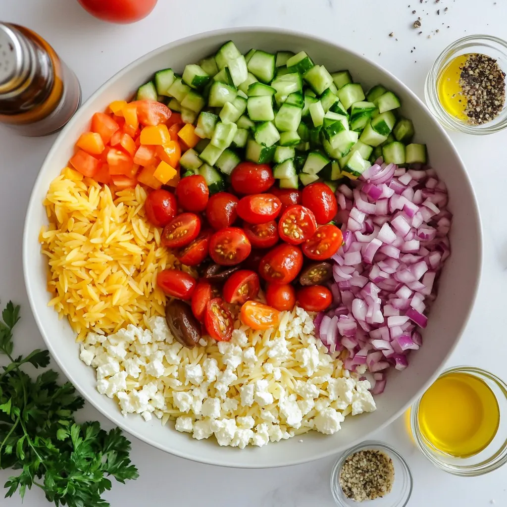 To make the dressing, grab a small bowl. Whisk together 1/4 cup of olive oil, 2 tablespoons of lemon juice, 1 teaspoon of dried oregano, and some salt and pepper. This dressing gives the salad a tangy flavor. Now, pour the dressing over your vegetable mix. Toss everything gently to coat the veggies. Next, add the cooled orzo to the bowl. Fold in 1 cup of crumbled feta cheese and 1/4 cup of chopped fresh parsley. Taste your salad and adjust the seasoning if needed. You might want a bit more salt or lemon juice. Chill it in the fridge for at least 30 minutes. This helps the flavors mix perfectly.