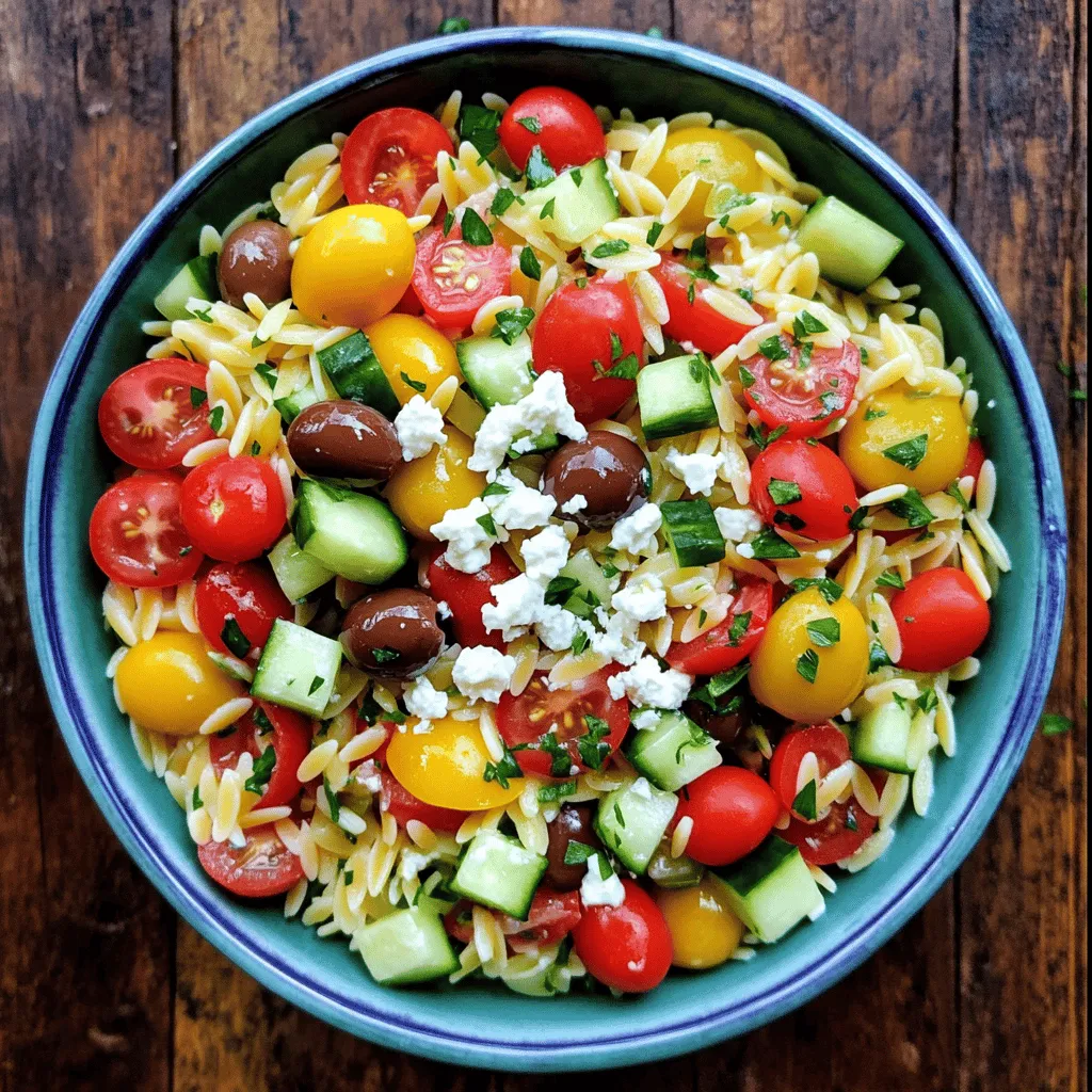 Using these fresh ingredients makes your Greek orzo salad vibrant and tasty. Enjoy the bright colors and flavors!