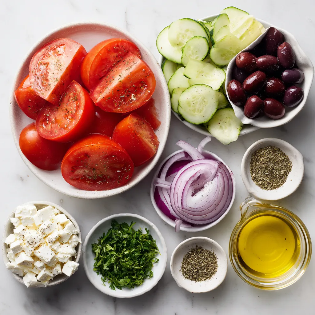 A refreshing salad featuring ripe tomatoes, cucumbers, red onion, olives, and feta cheese.
